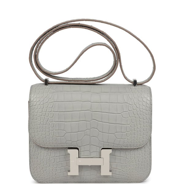 This Hermes Constance 1-18 Gris Perle Matte Alligator Mississippiensis leather with palladium hardware, tonal stitching, metal H snap closure, and an adjustable strap.The interior is lined Gris Perle lambskin leather and has an open pocket on the front wall, a center divide, removable mirror and a slit pocket on the back wall.