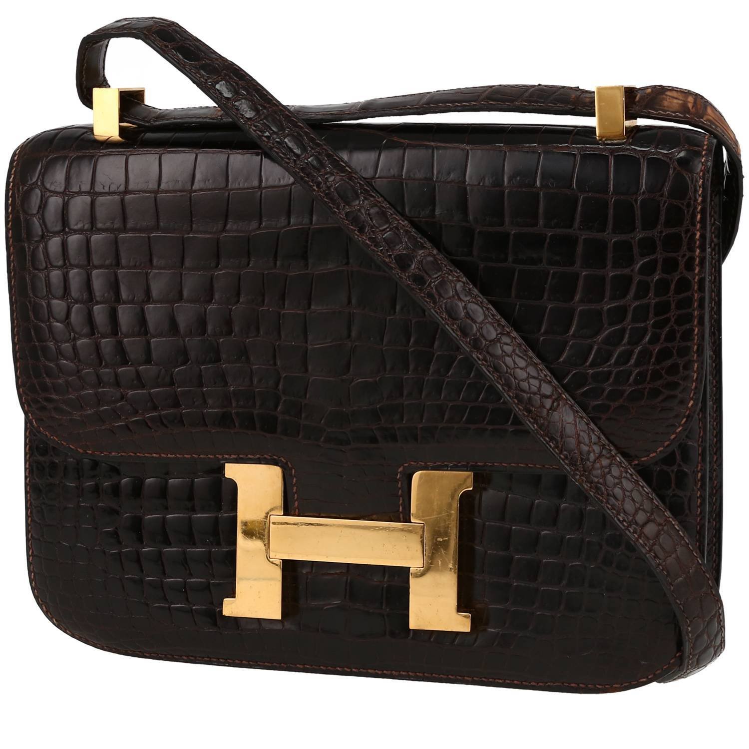 Elegant Hermès Constance handbag in brown porosus crocodile, hardware in gilt metal, convertible strap in brown crocodile allowing the bag to be worn in the hand or on the shoulder.