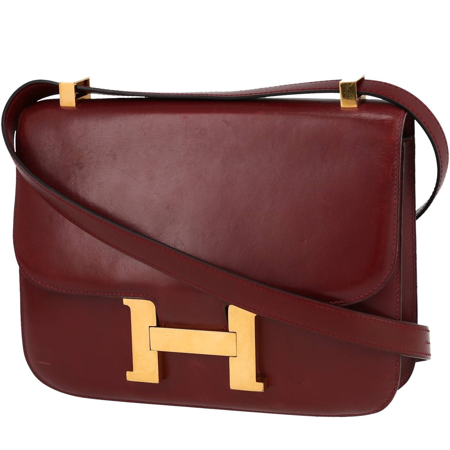 Elegant Hermès Constance handbag in burgundy box leather, hardware in gilt metal, convertible strap in burgundy leather allowing the bag to be worn in the hand or on the shoulder.