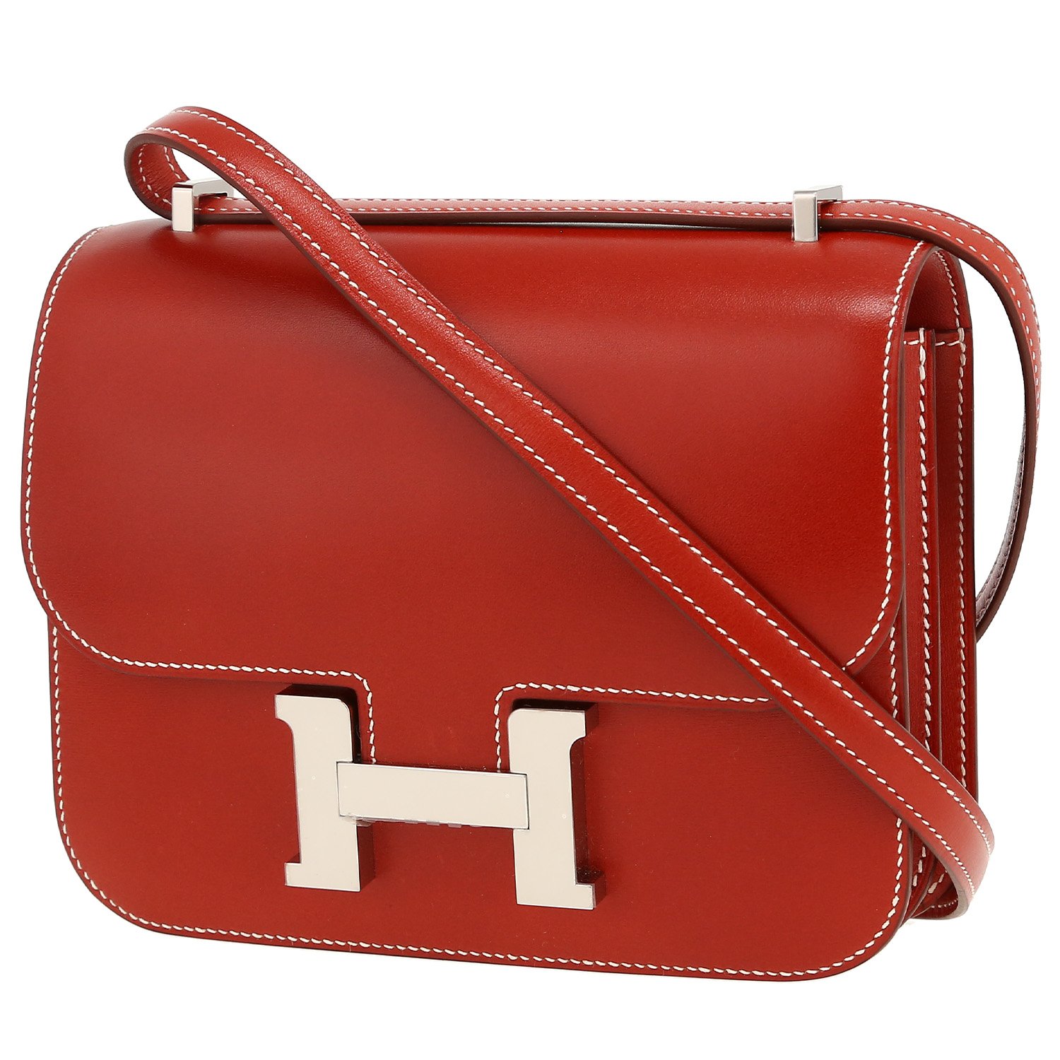 Famous mini Hermes Constance shoulder bag in brick red box leather, hardware in palladium metal, white stitchings, convertible strap in brick red box leather allowing the bag to be worn on the shoulder or accross the body.