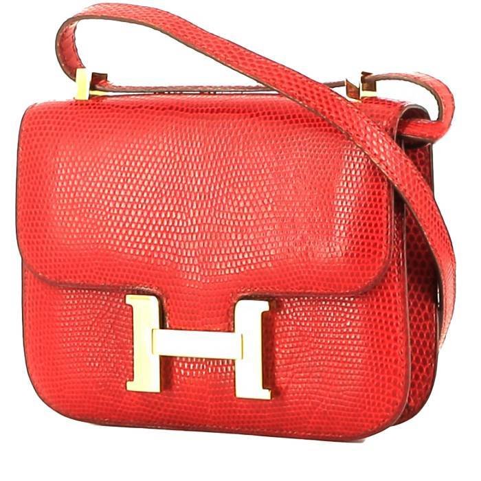 Elegant mini Hermès Constance shoulder bag in red lizzard, hardware in gilt metal, convertible strap in red leather allowing the bag to be worn on the shoulder or accross the body.