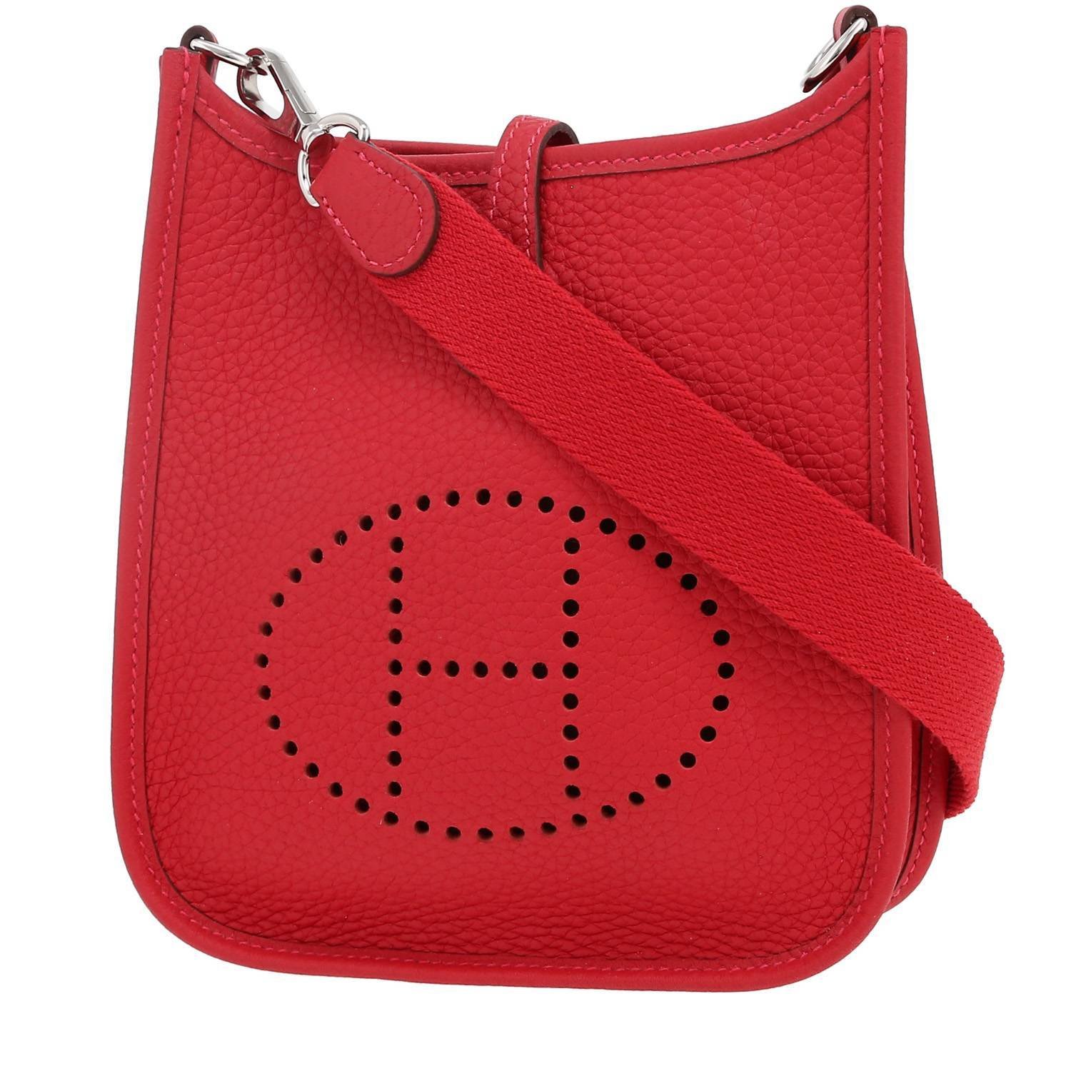 Timeless mini Hermès Evelyne shoulder bag in red togo leather, hardware in palladium metal, one removable shoulder strap in red canvas allowing the bag to be worn on the shoulder or accross the body.
