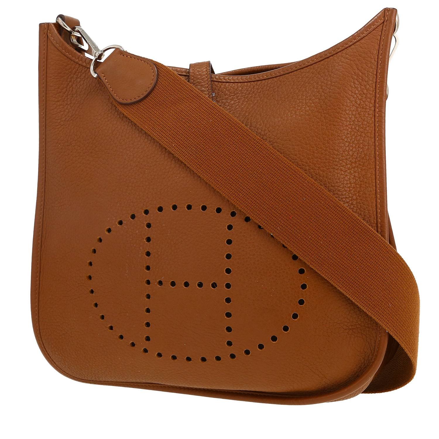 Elegant Hermès Evelyne shoulder bag in Biscuit togo leather, hardware in palladium metal, one removable shoulder strap in Biscuit canvas allowing the bag to be worn on the shoulder or accross the body.
