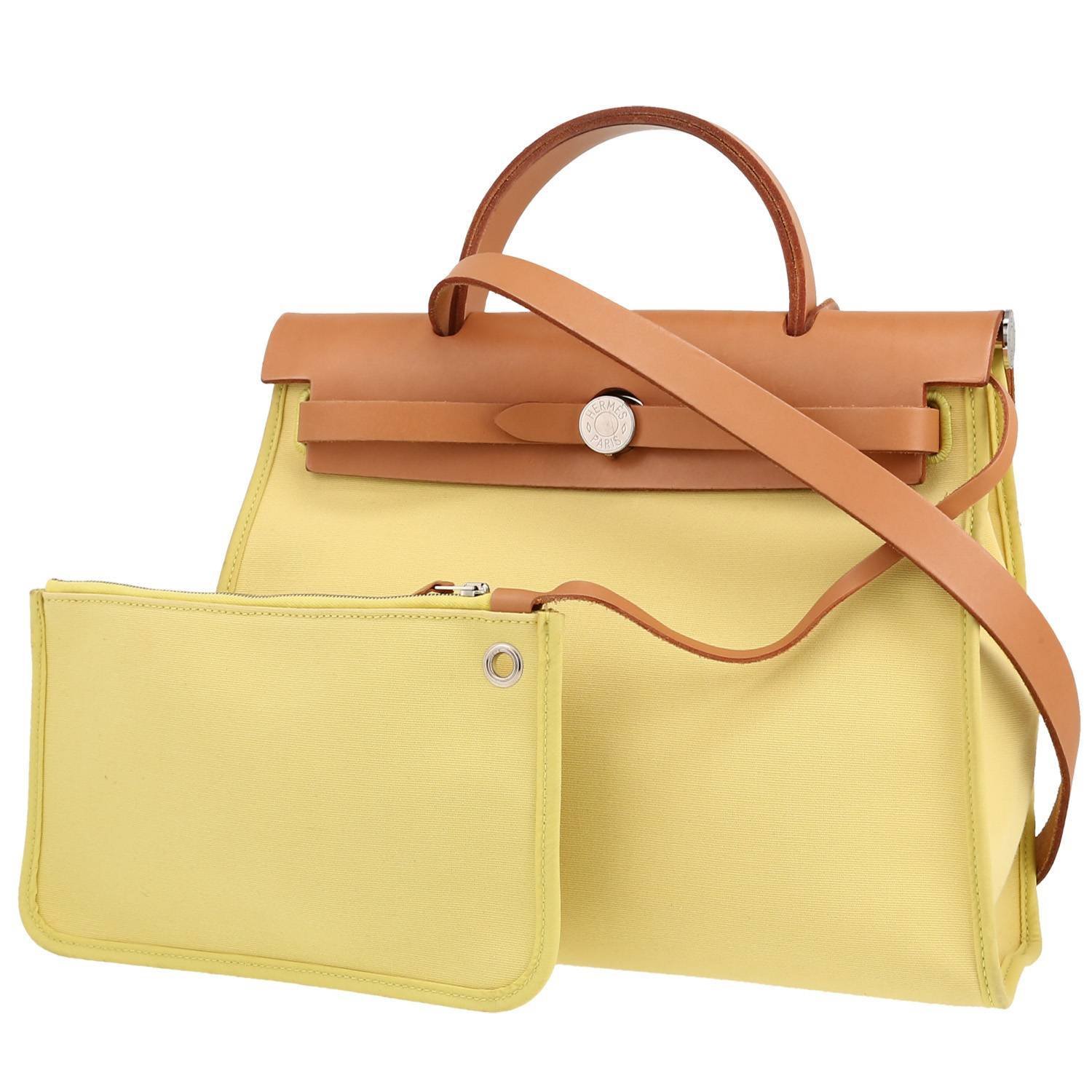 Wonderful Hermès Herbag bag worn on the shoulder or carried in the hand in yellow canvas, hardware in palladium metal, simple handle Hunter cowhide, one strap in Hunter cowhide allowing the bag to be worn in the hand or on the shoulder.