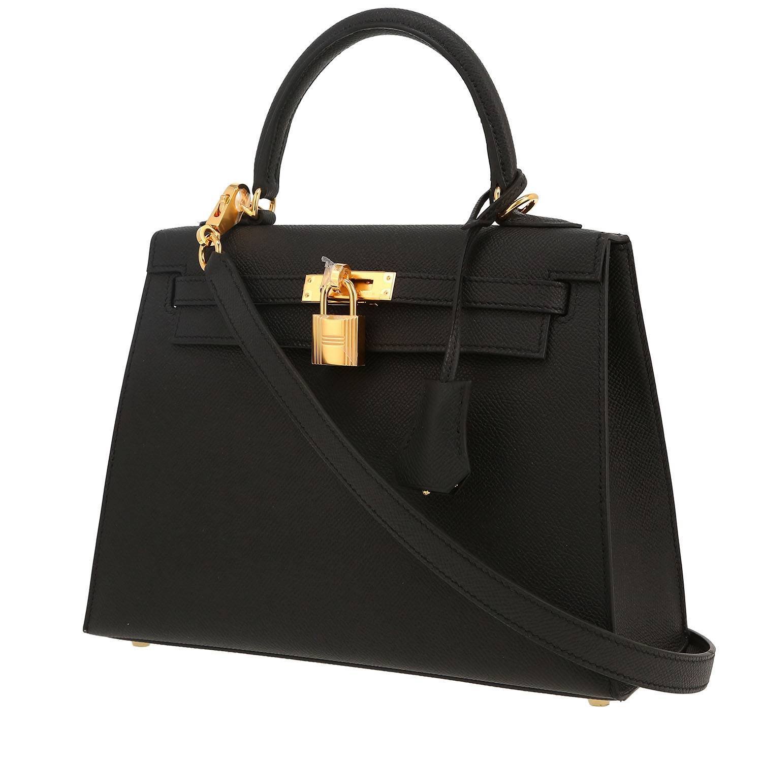 Unavoidable Hermès Kelly 25 cm handbag in black epsom leather, hardware in gilt metal, simple handle in black epsom leather, black epsom leather removable strap to be worn accross the body allowing the bag to be worn in the hand or on the shoulder.