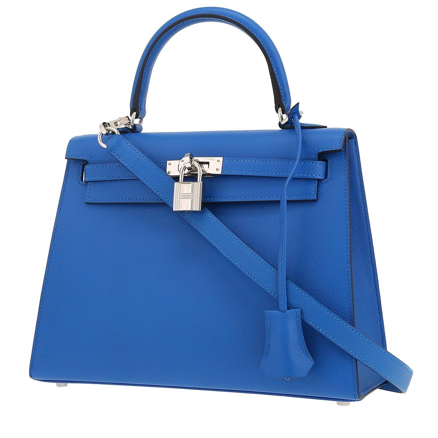 Wonderful Hermès Kelly 25 cm handbag in blue epsom leather, hardware in palladium metal, simple handle in blue epsom leather, blue epsom leather removable strap to be worn accross the body allowing the bag to be worn in the hand or on the shoulder.