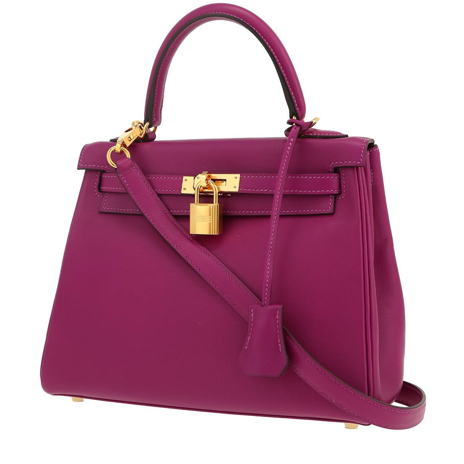 Wonderful Hermes Kelly 25 cm handbag in purple Anemone Swift leather, hardware in gilt metal, simple handle in purple Anemone Swift leather, one removable strap in purple Anemone Swift leather allowing the bag to be worn in the hand or on the shoulder.
