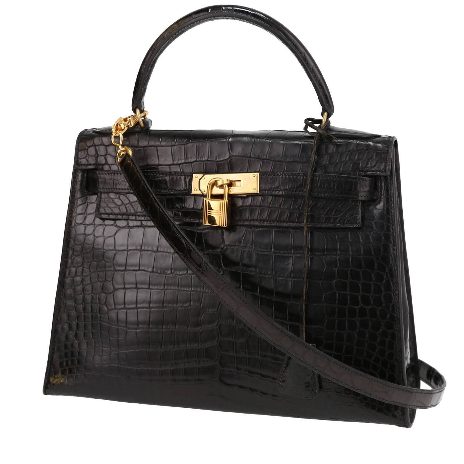 Elegant Hermès Kelly 28 cm handbag in black porosus crocodile, hardware in gilt metal, simple handle in black crocodile, black crocodile removable unsigned handle allowing the bag to be worn in the hand or on the shoulder.
