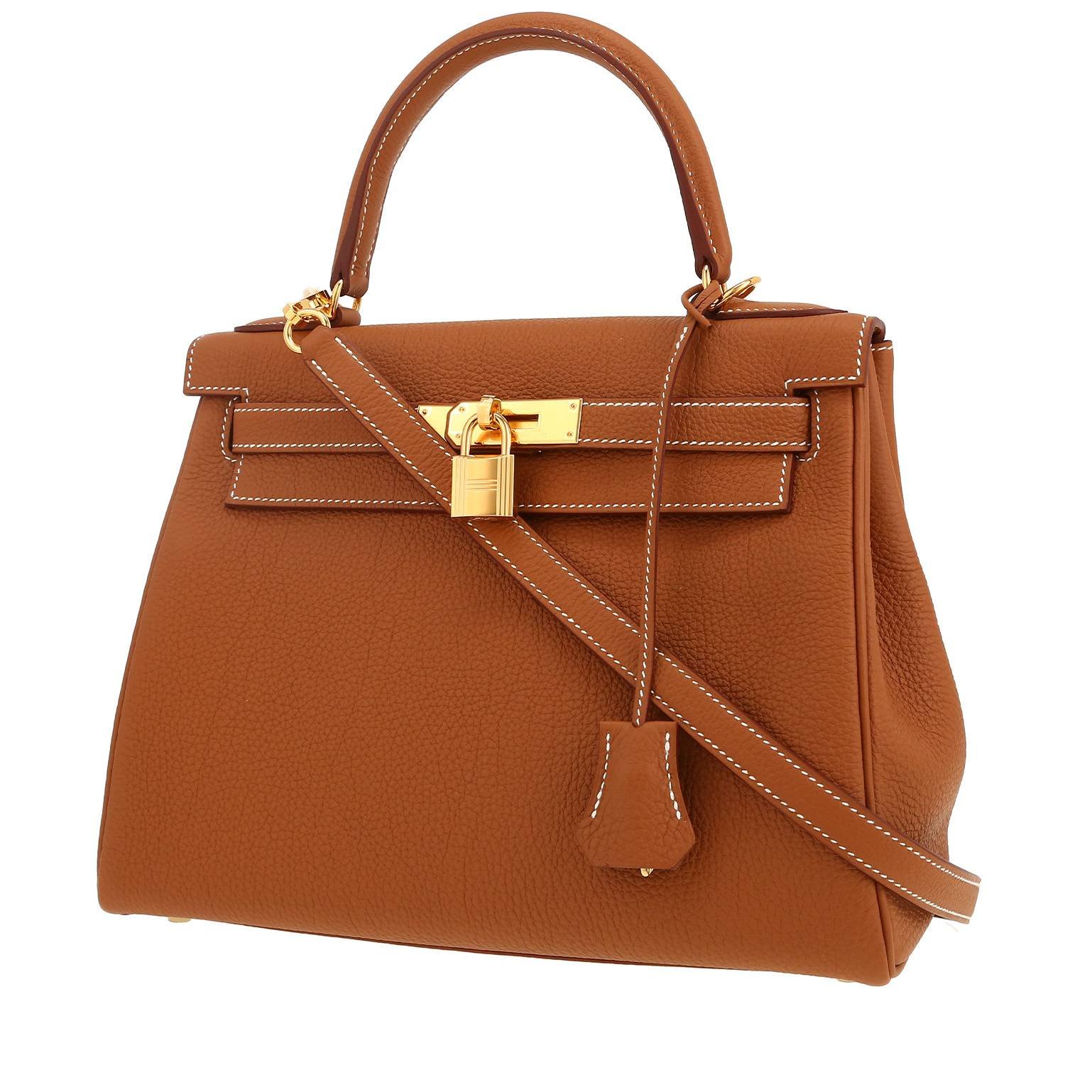 Elegant Hermès Kelly 28 cm handbag in gold togo leather, hardware in gilt metal, simple handle in gold togo leather, gold togo leather removable strap to be worn accross the body allowing the bag to be worn in the hand or on the shoulder.