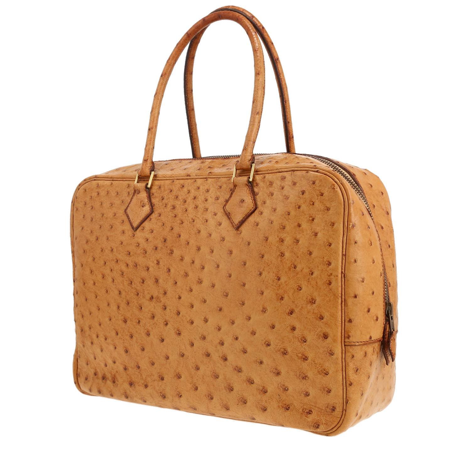 Wonderful Hermès Plume handbag in gold ostrich leather, hardware in gilt metal, double handle in gold ostrich leather allowing the bag to be worn in the hand or on the shoulder.