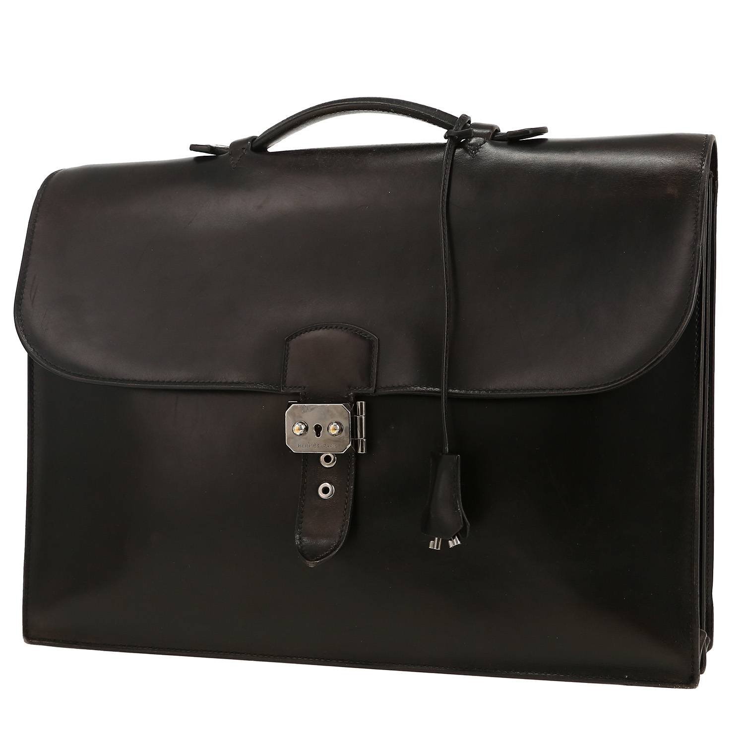 Unavoidable Hermès Sac à dépêches briefcase in black box leather, hardware in silver metal, simple handle in black leather allowing the bag to be worn in the hand.