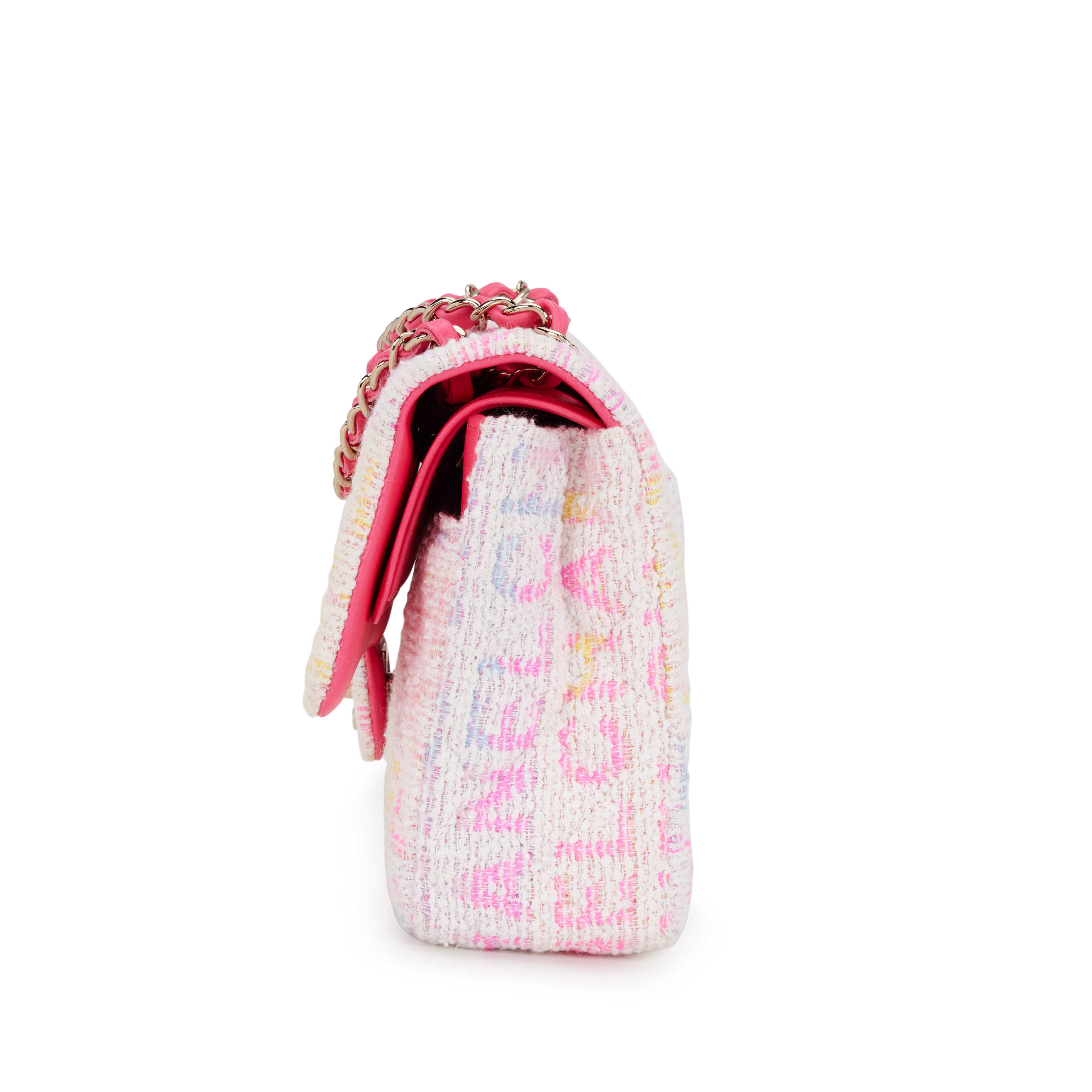 Chanel Hot Pink, Yellow, Purple and White Quilted Letter Logo Printed Tweed Medium Double Flap Bag Light Gold Hardware, 2024The interior is lined in a pink leatherIncludes dust bag, felt protector, and boxThis item is final sale and not eligible for return