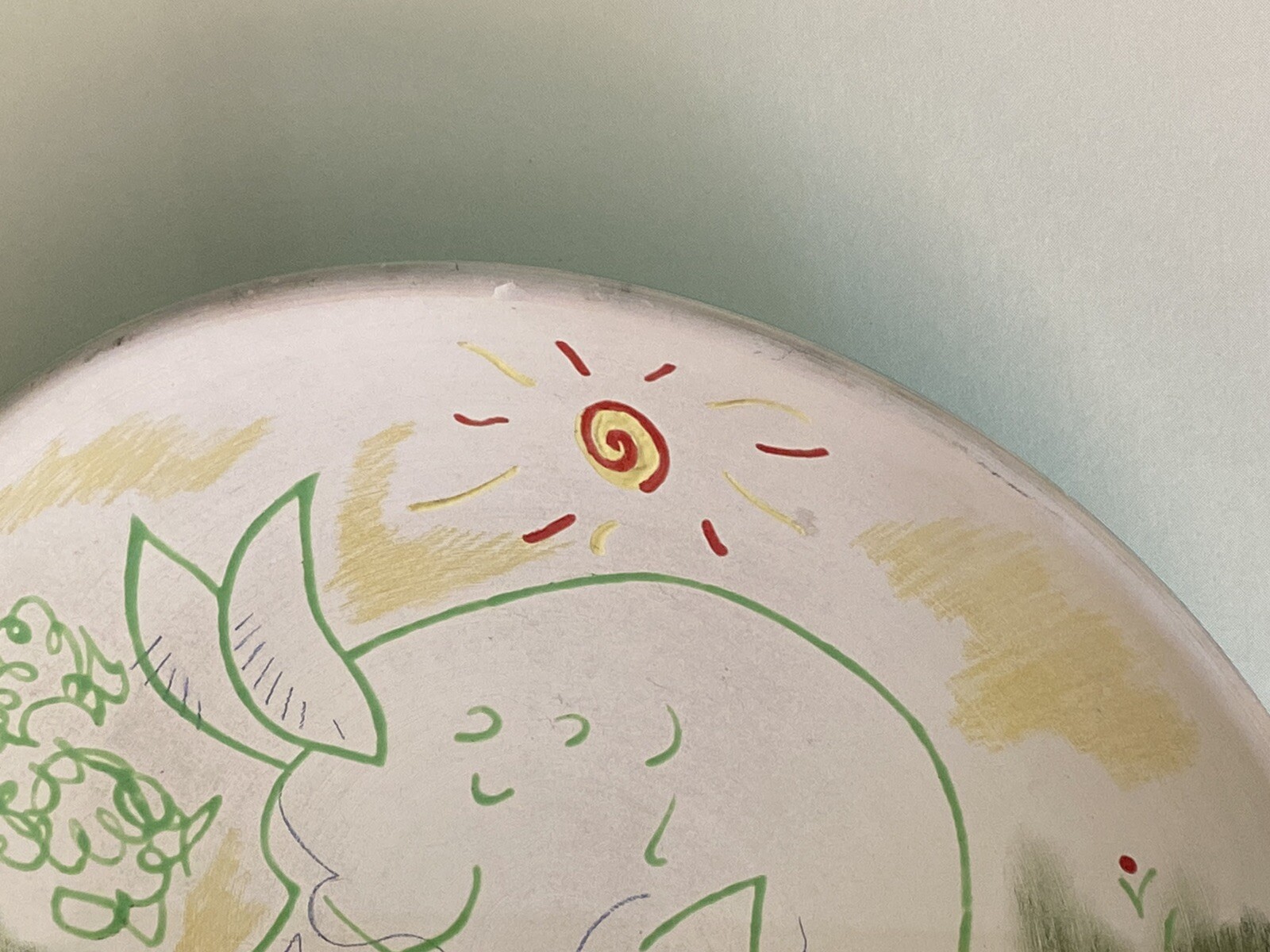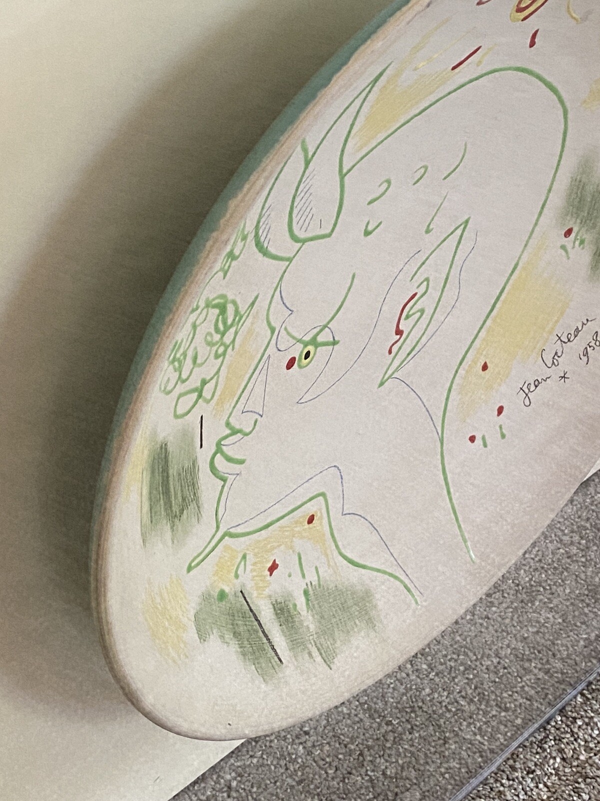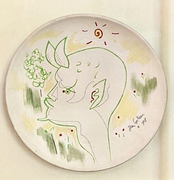 Beautiful estate piece by Jean Cocteau (French 1889-1963). Chèvre-pied boudeur decorative plate. White earth ware and colored glaze. 14.75 inches in diameter (36.8 cm). Signed and dated Jean Cocteau 1958. Marked and numbered 12/30.