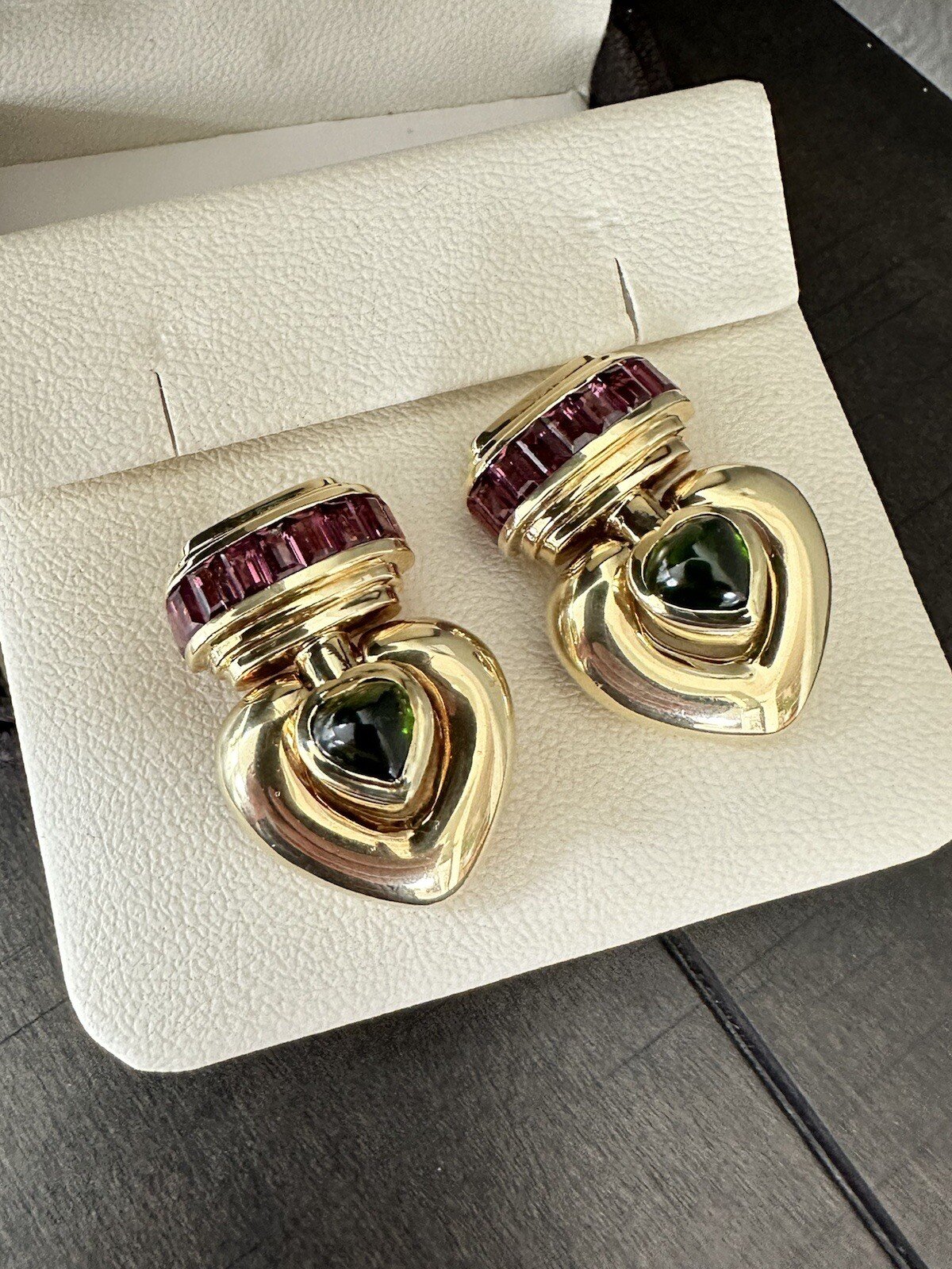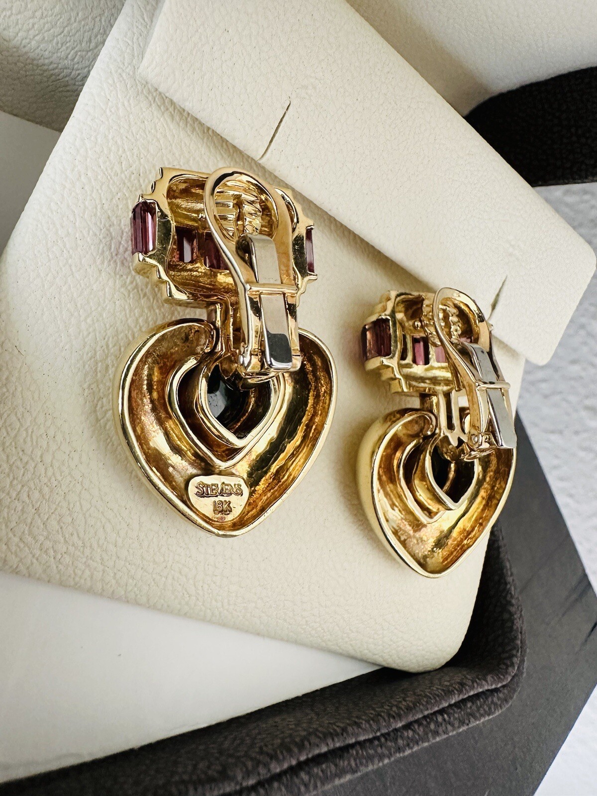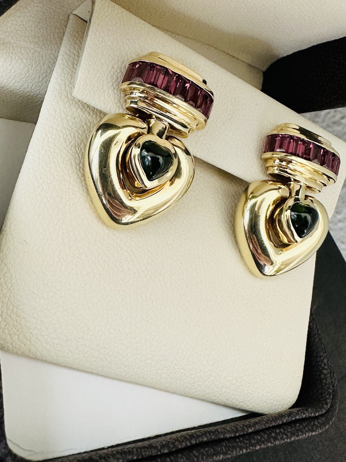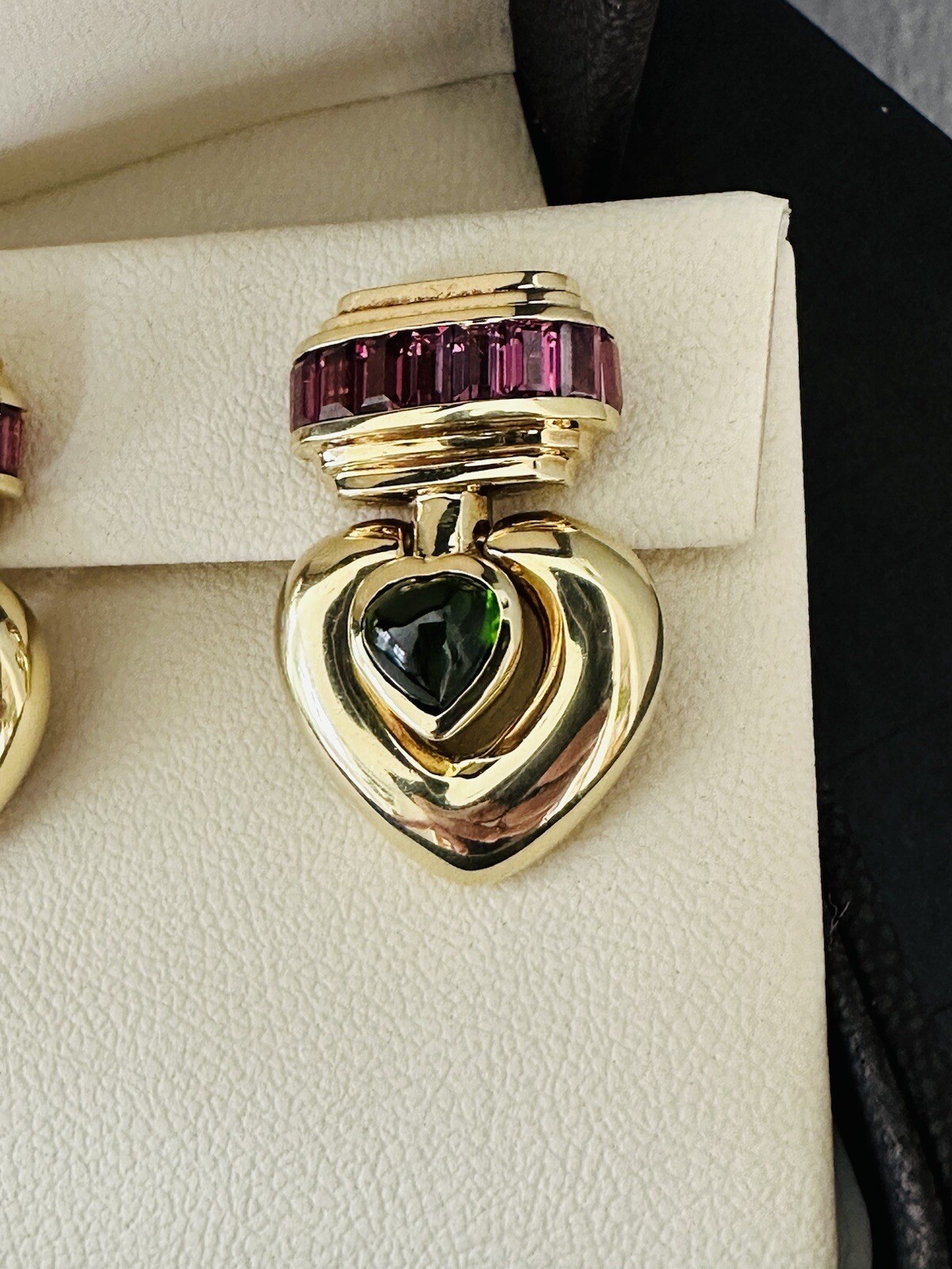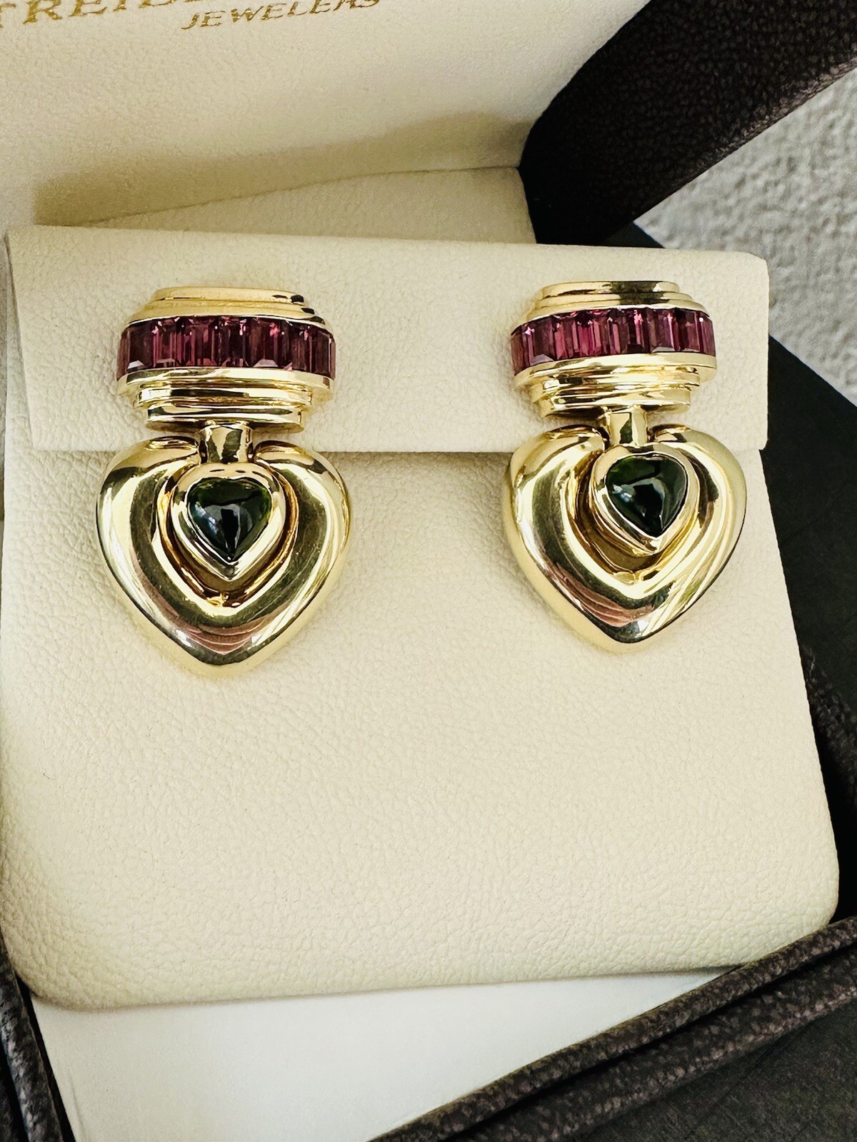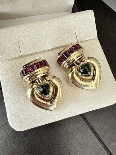 These Jeffrey Stevens earrings are made of 18k yellow gold and feature heart-shaped green tourmaline stones with pink tourmaline accents. The dangle/drop style makes them perfect for special occasions such as engagement, anniversary, or Valentine’s Day. The earrings weigh 44 grams and are pre-owned.