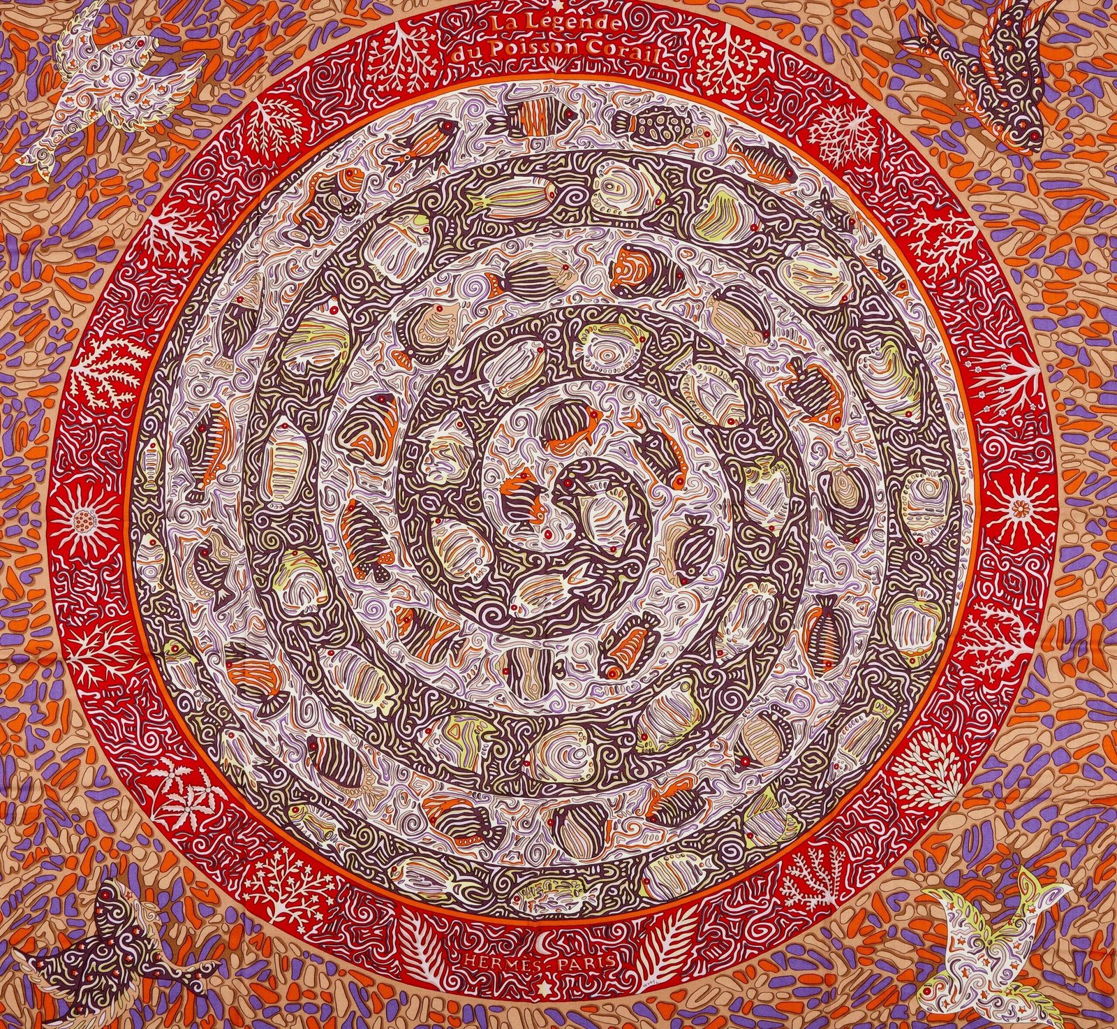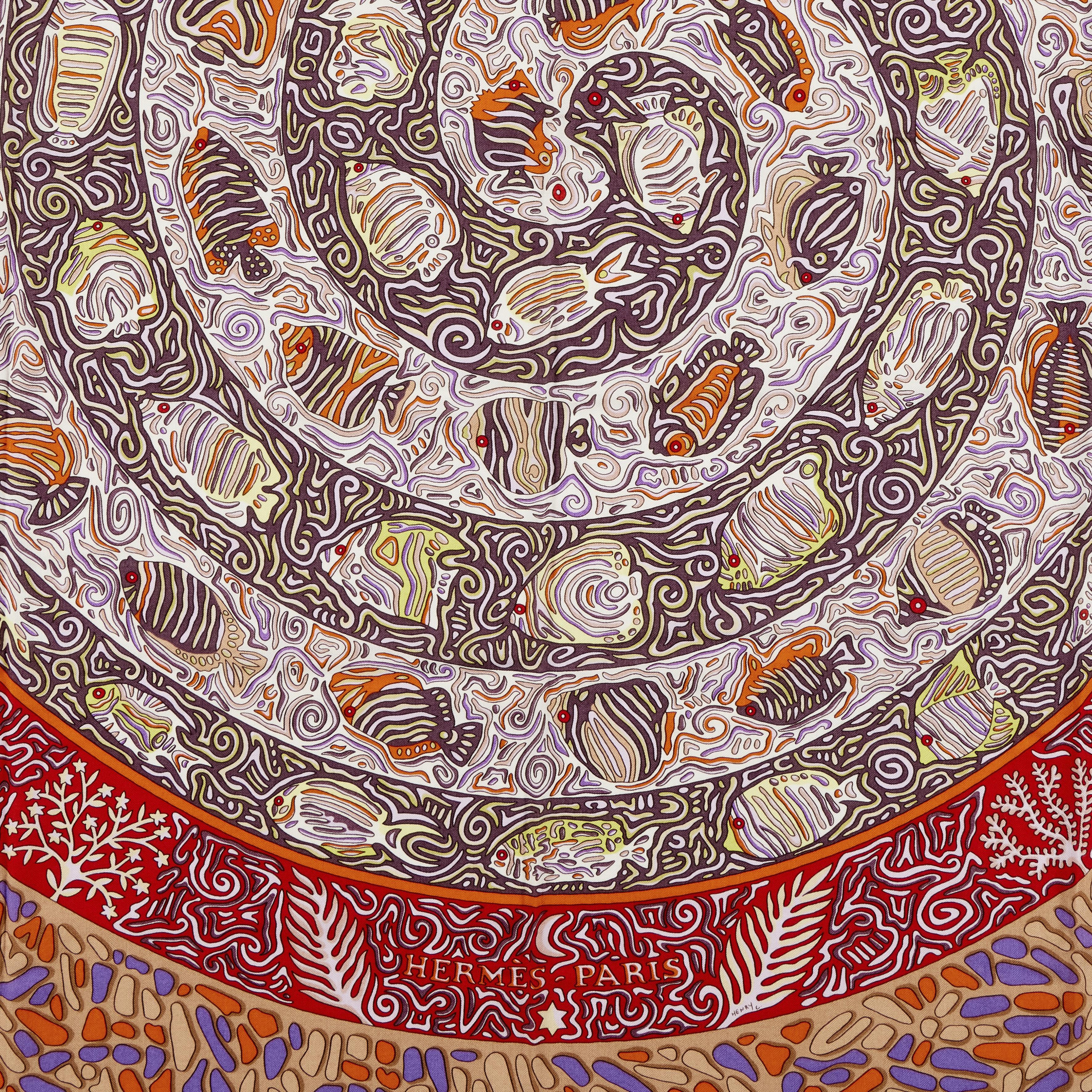 Hermès La Legende Du Poisson Corail Cashmere and Silk Shawl 140Designed by Christine Henry65% cashmere, 35% silkIncludes ribbon and boxThis item is final sale and not eligible for return