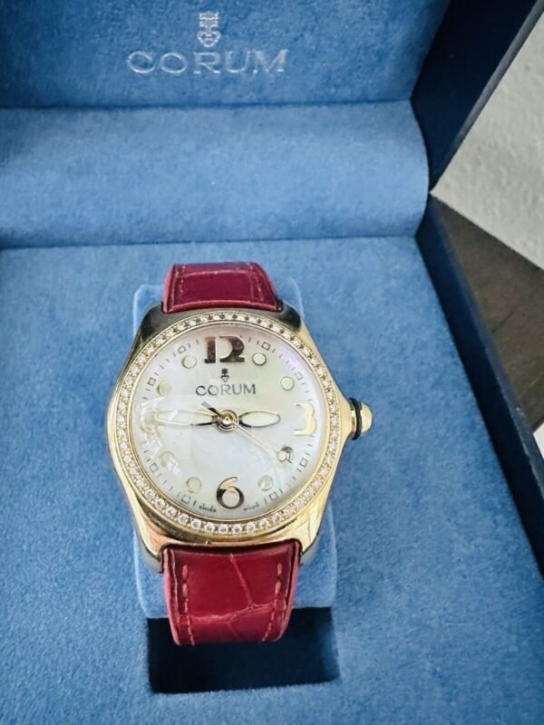 Swiss-made with a precise quartz movement, this timepiece features a fixed diamond bezel that adds a touch of glamour to its classic round shape. The watch displays Arabic numerals and diamond markers, enhancing its elegance. A secure butterfly clasp ensures a comfortable fit for wrist sizes up to 6.76 inches. This Corum Bubble watch comes in its original box, ready to add a touch of luxury to any ensemble.