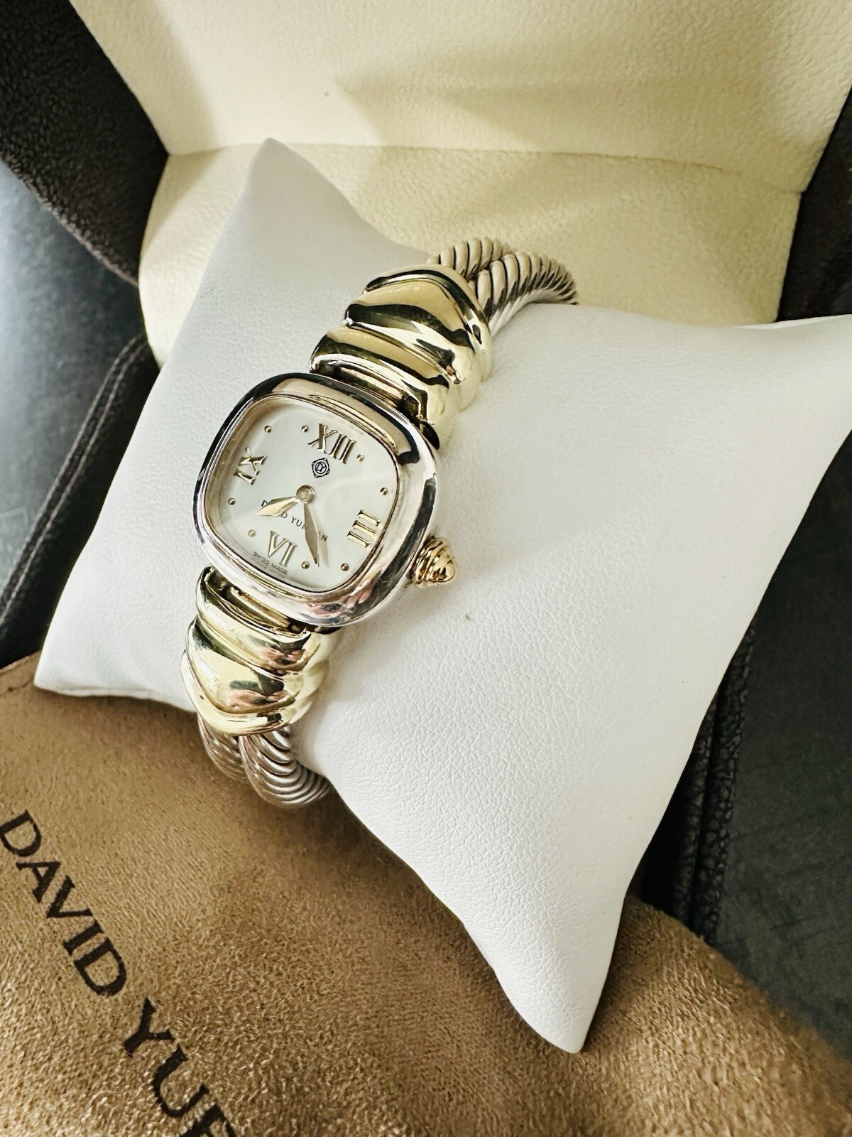 This beautiful David Yurman Cable Watch is a must-have for any stylish woman. The stunning white Mother of Pearl dial and Round Indexes is protected by a silver bezel and surrounded by a double cable bracelet made of 14K Gold and Sterling Silver. The watch features a Quartz movement, Swiss made display, and a cushion-shaped case.