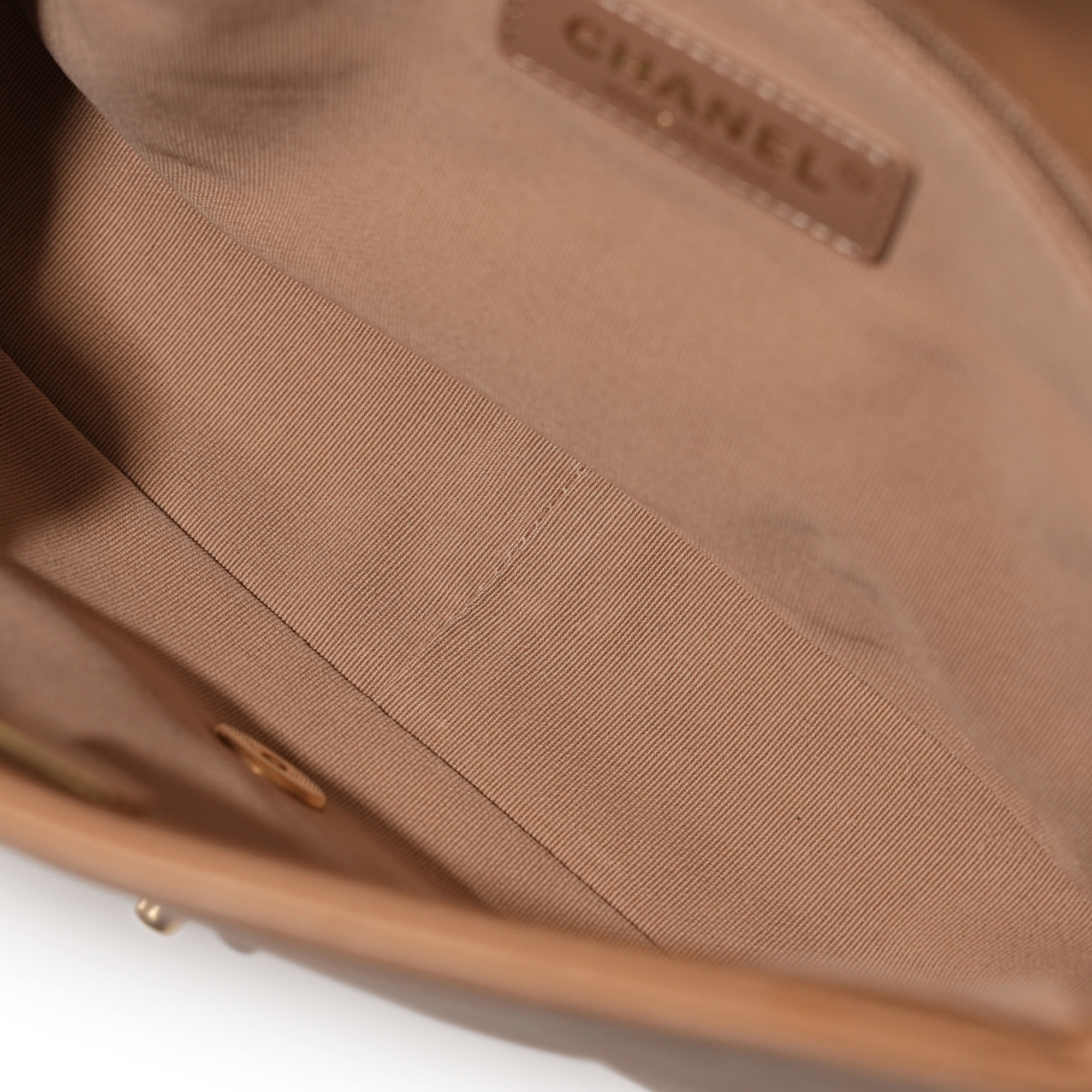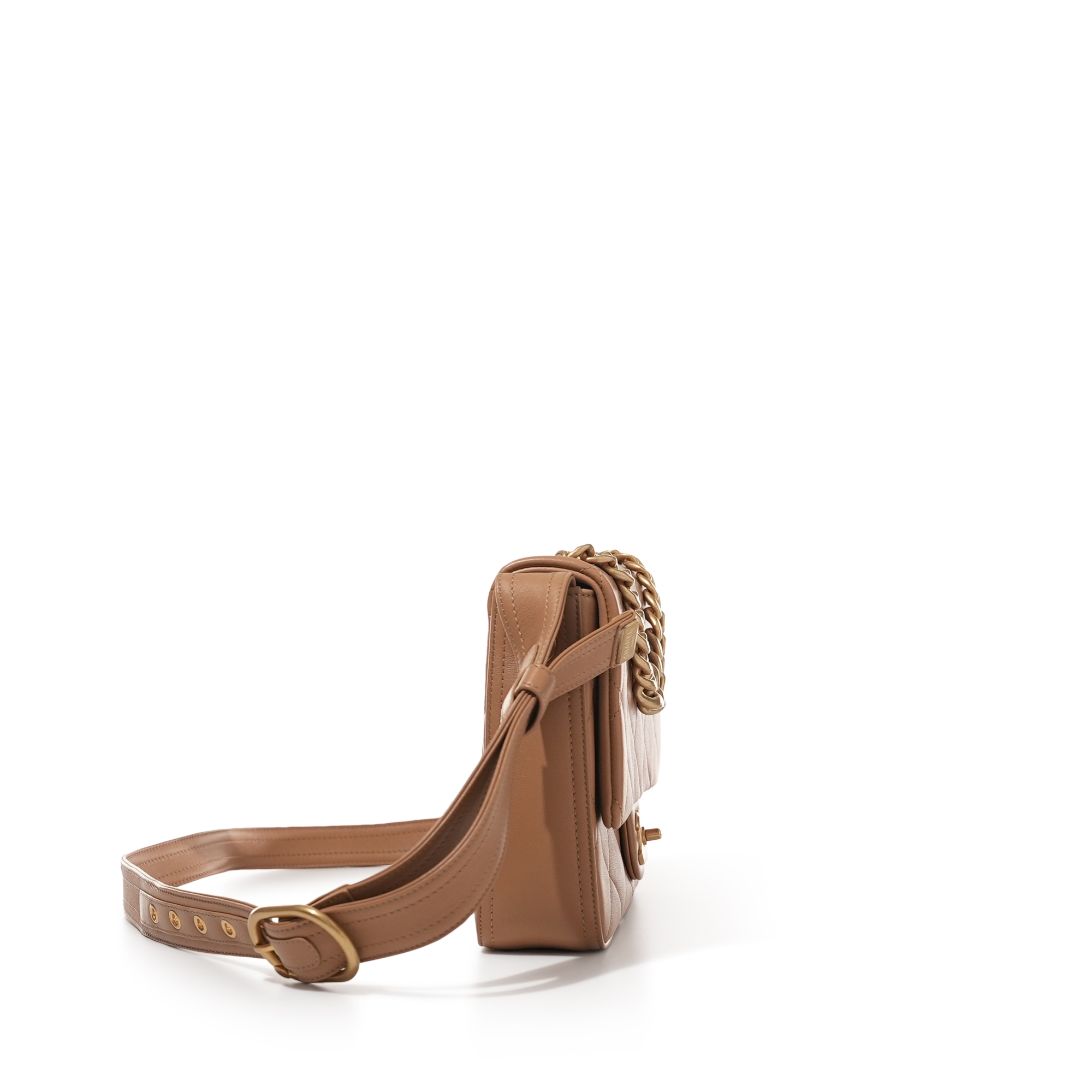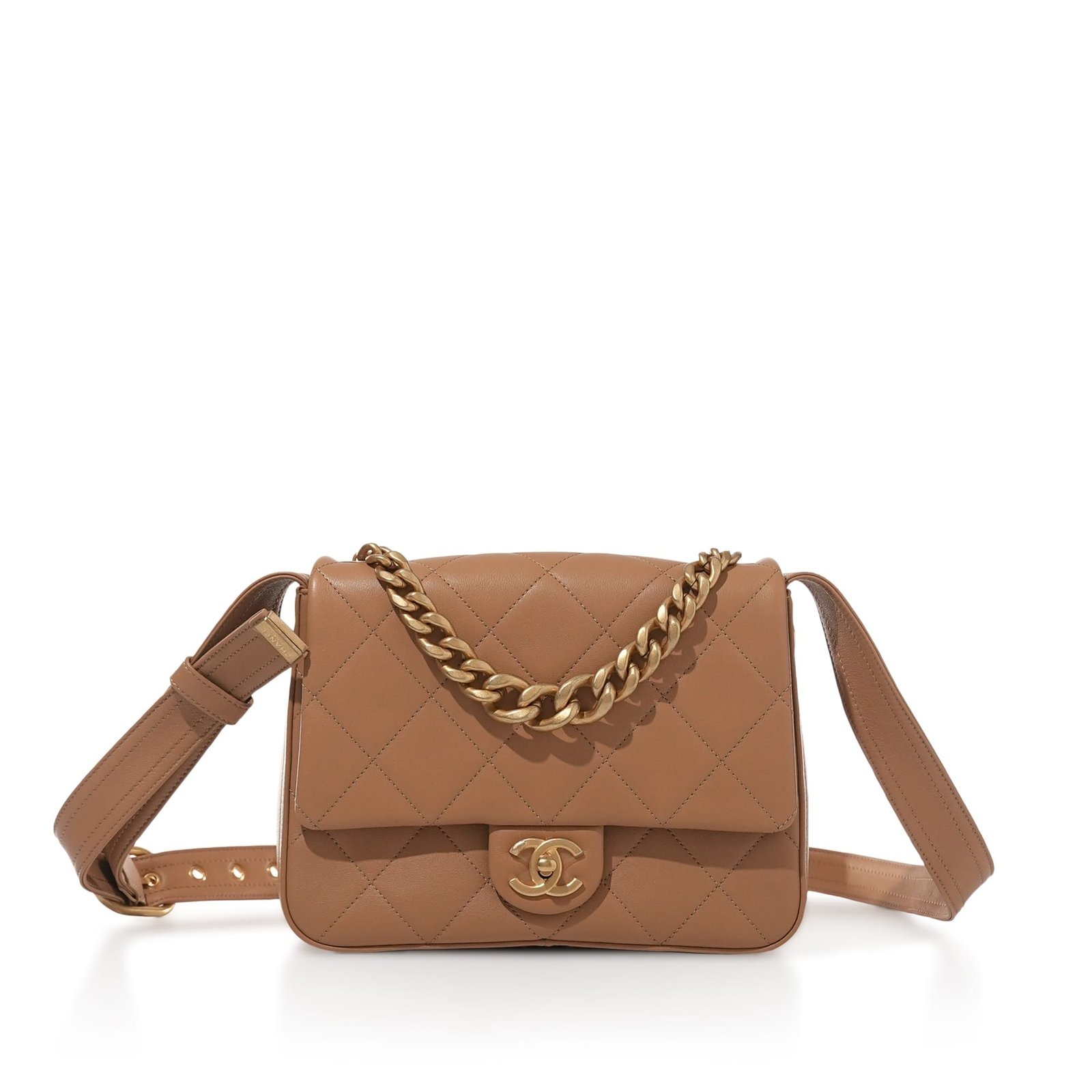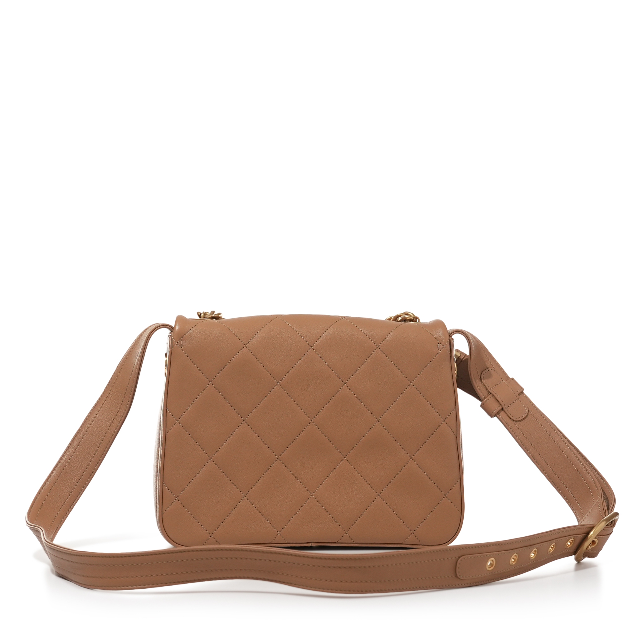 Chanel Light Brown Quilted Lambskin Crossbody Flap Bag Aged Gold HardwareThe interior is lined with tonal textile materialIncludes dust bag and boxThis item is final sale and not eligible for return