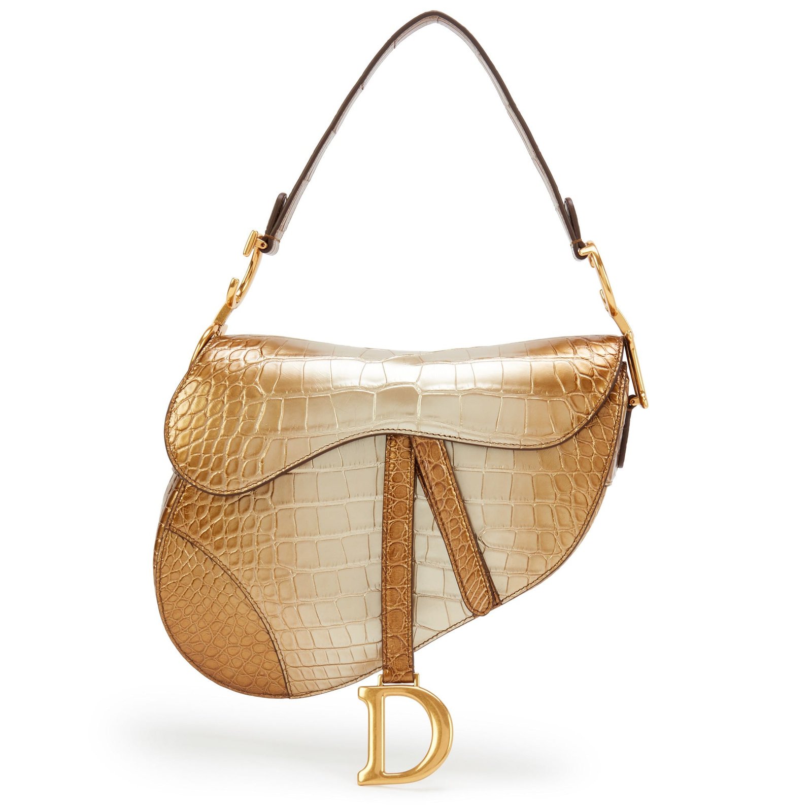 Christian Dior Metallic Gold Gradient Shiny Alligator Saddle Bag Gold Hardware, 2020The interior is lined in brown suedeIncludes dustbag, gloves, gloves dustbag, authenticity card, care booklet, CITES, front hardware dustbag, and boxThis item is final sale and not eligible for return