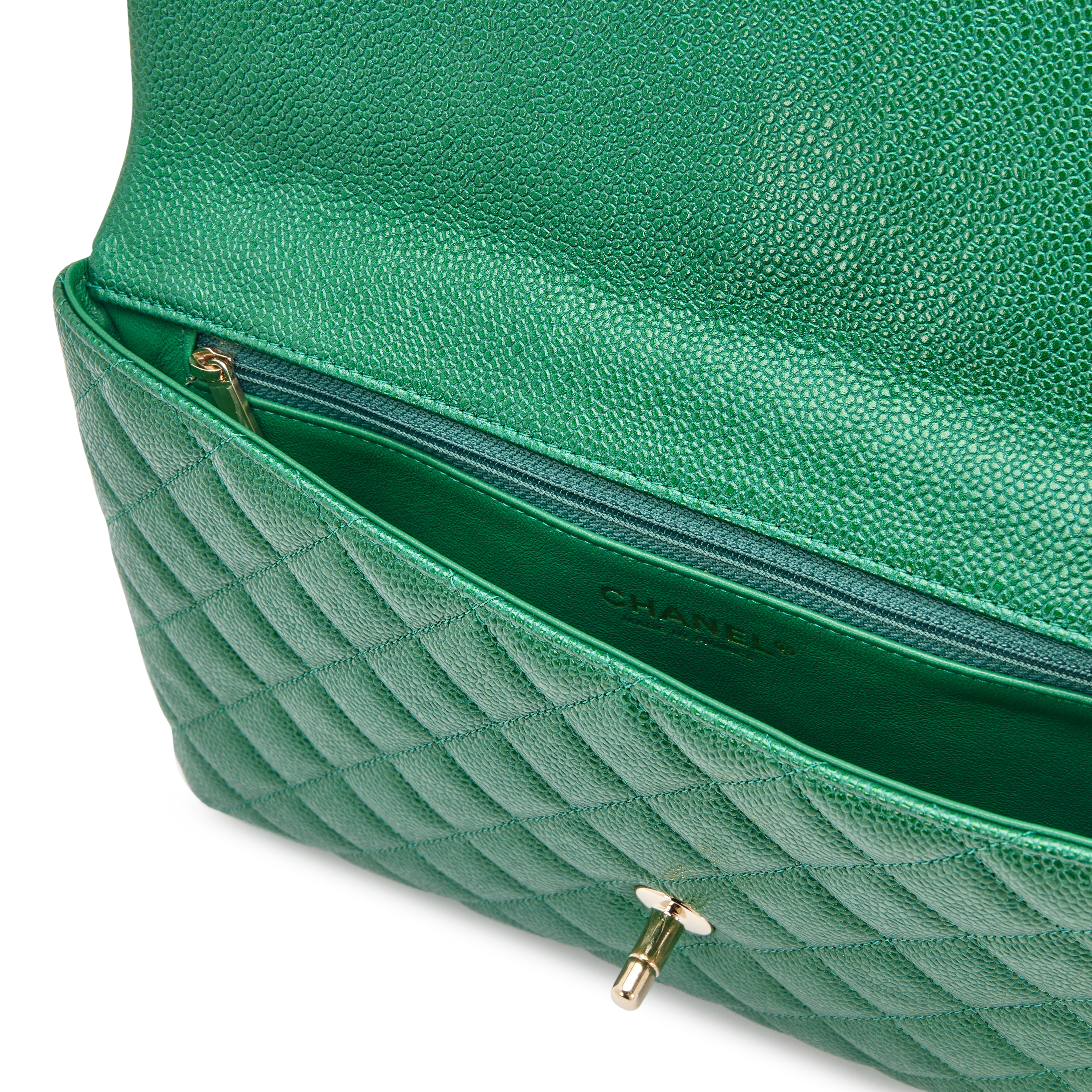 Chanel Metallic Pearly Green Quilted Caviar Classic Clutch Gold Hardware, 2018The interior is lined in a tonal leatherIncludes information booklet, dust bag, and boxThis item is final sale and not eligible for return