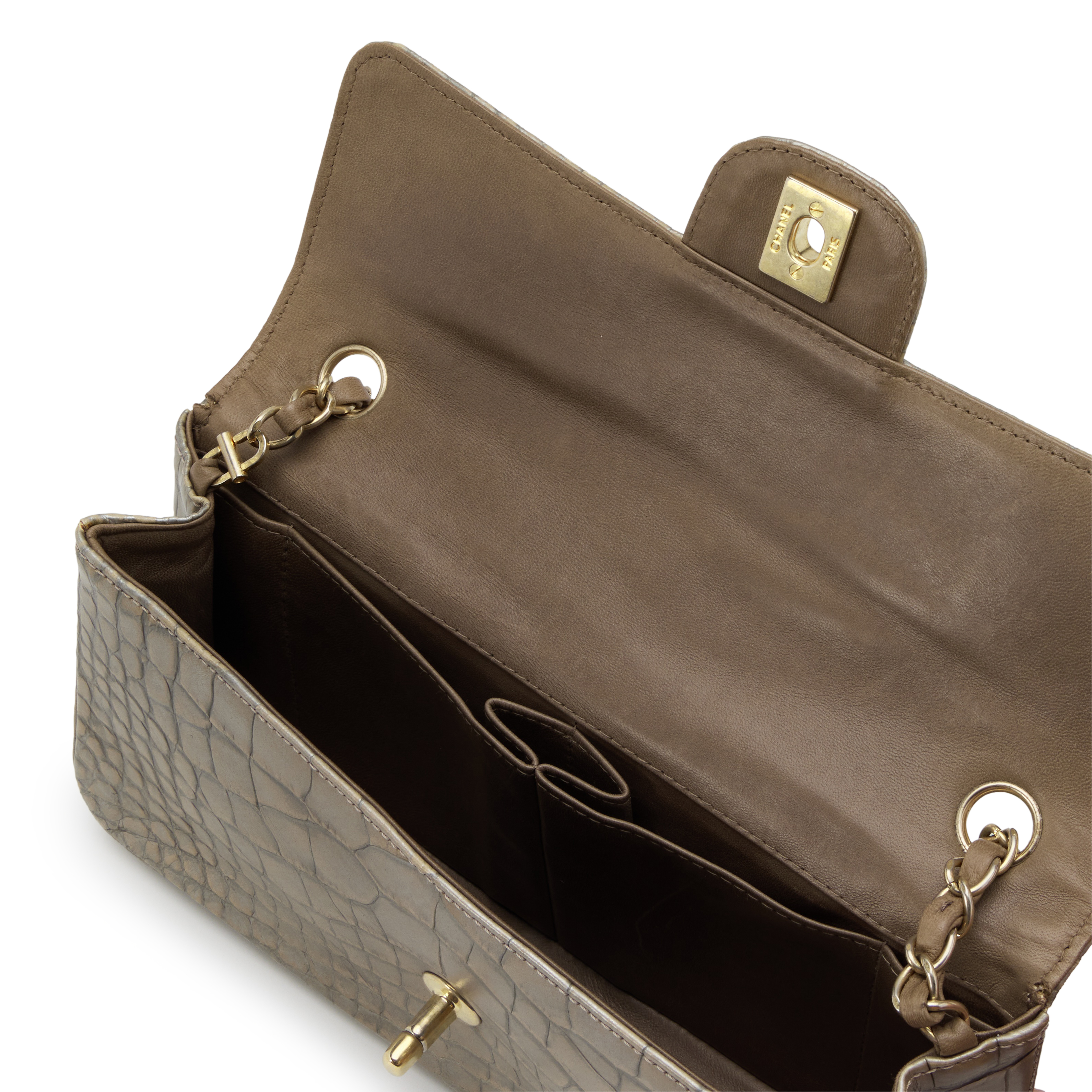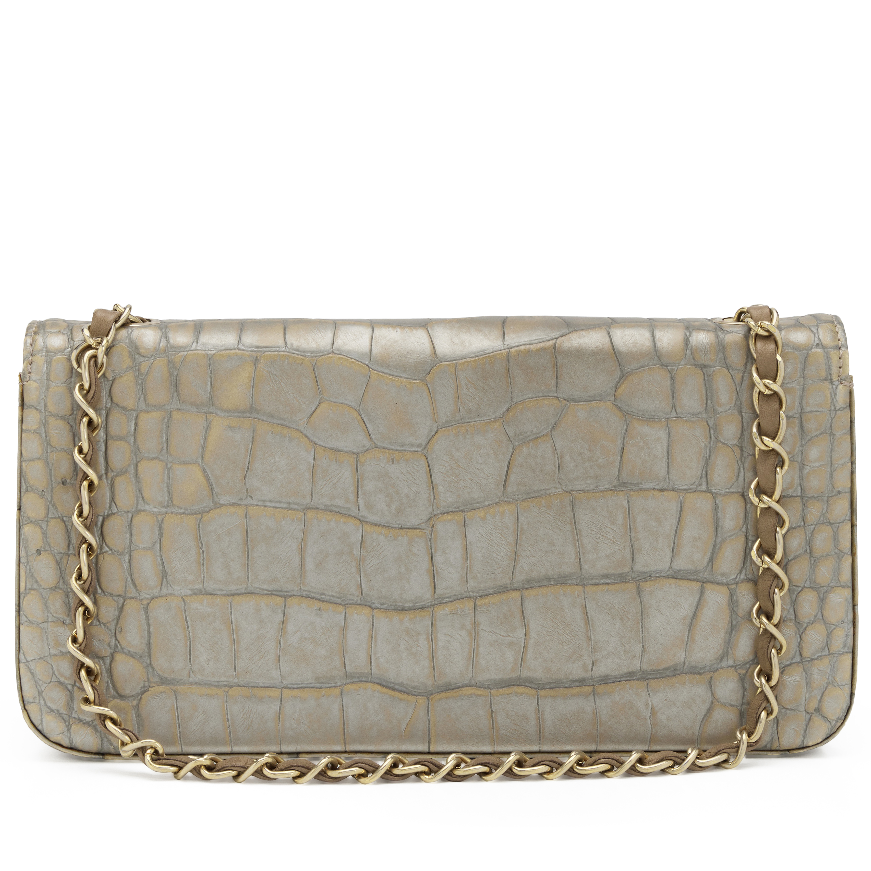 Chanel Metallic Silver and Taupe Alligator East West Classic Flap Bag Aged Gold Hardware, 2008The interior is lined in a brown leatherIncludes information booklet, felt protector, dust bag and boxThis item is final sale and not eligible for return