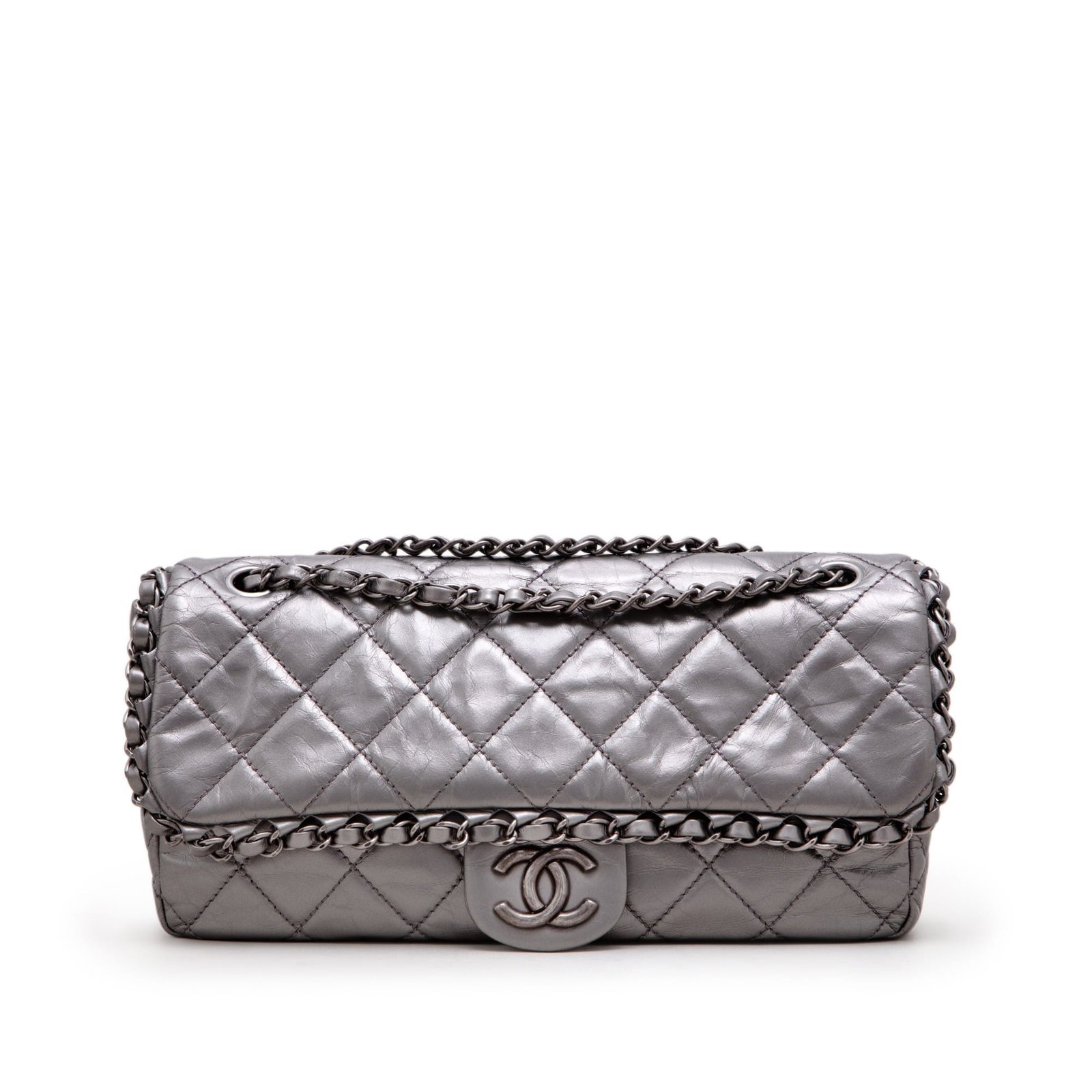 Chanel Metallic Silver Quilted Aged Calfskin Jumbo Chain Single Flap Ruthenium Hardware, 2012The interior is lined in black textile materialThis item is final sale and not eligible for return