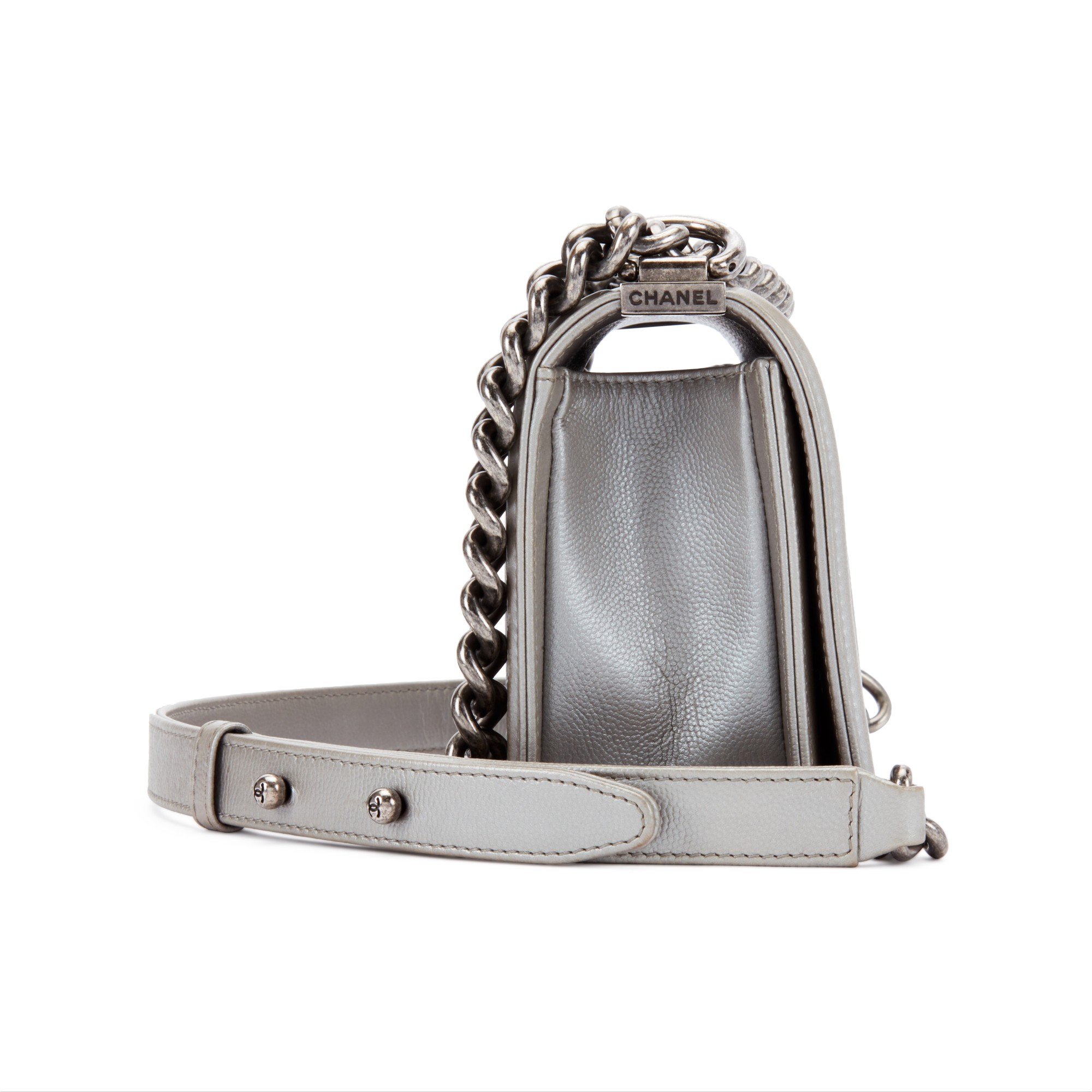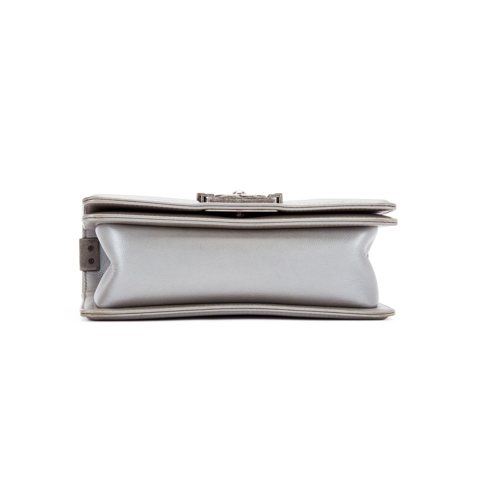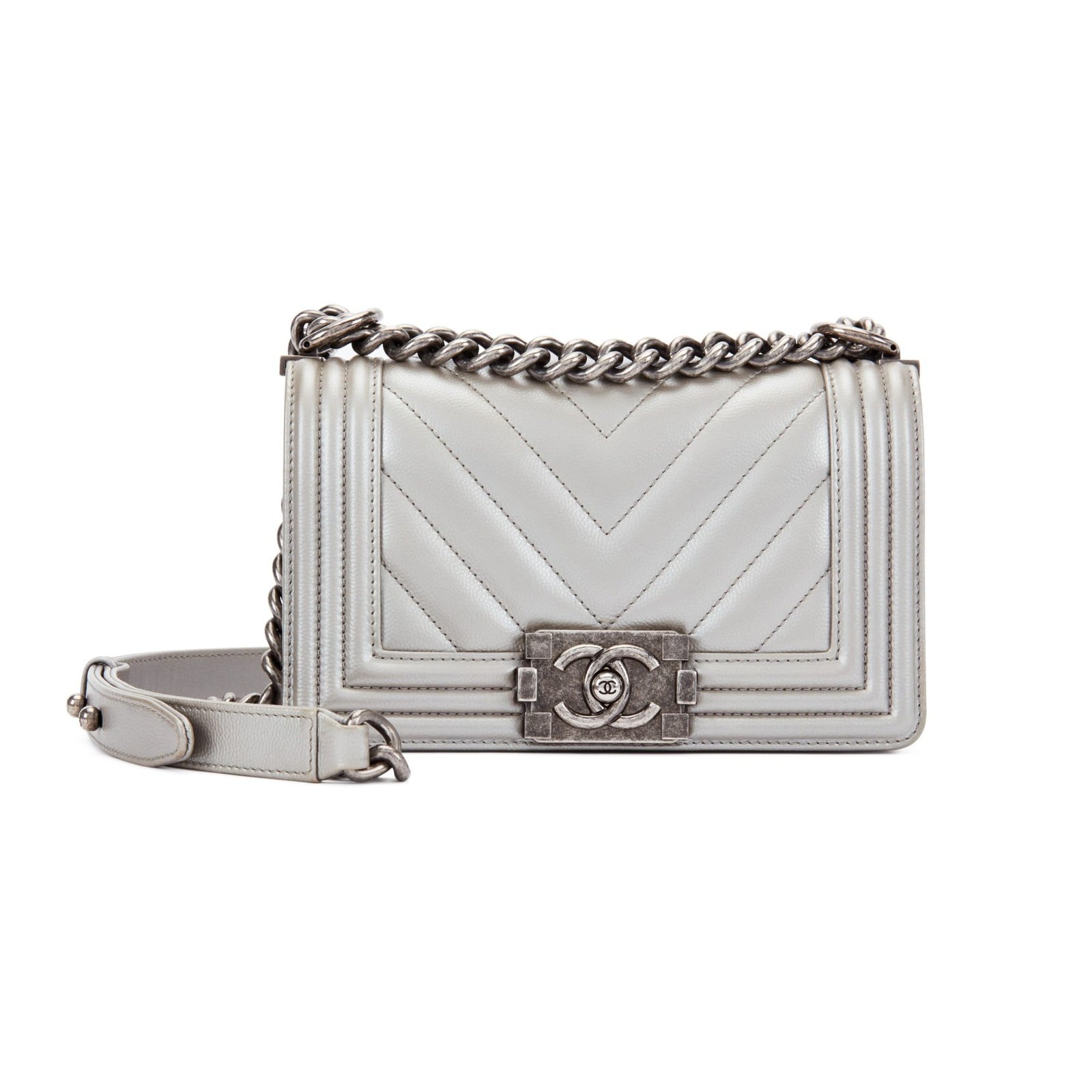 Chanel Metallic Silver Quilted Chevron Caviar Small Boy Bag Ruthenium Hardware, 2016The interior is lined in grey textile materialIncludes authenticity cardThis item is final sale and not eligible for return
