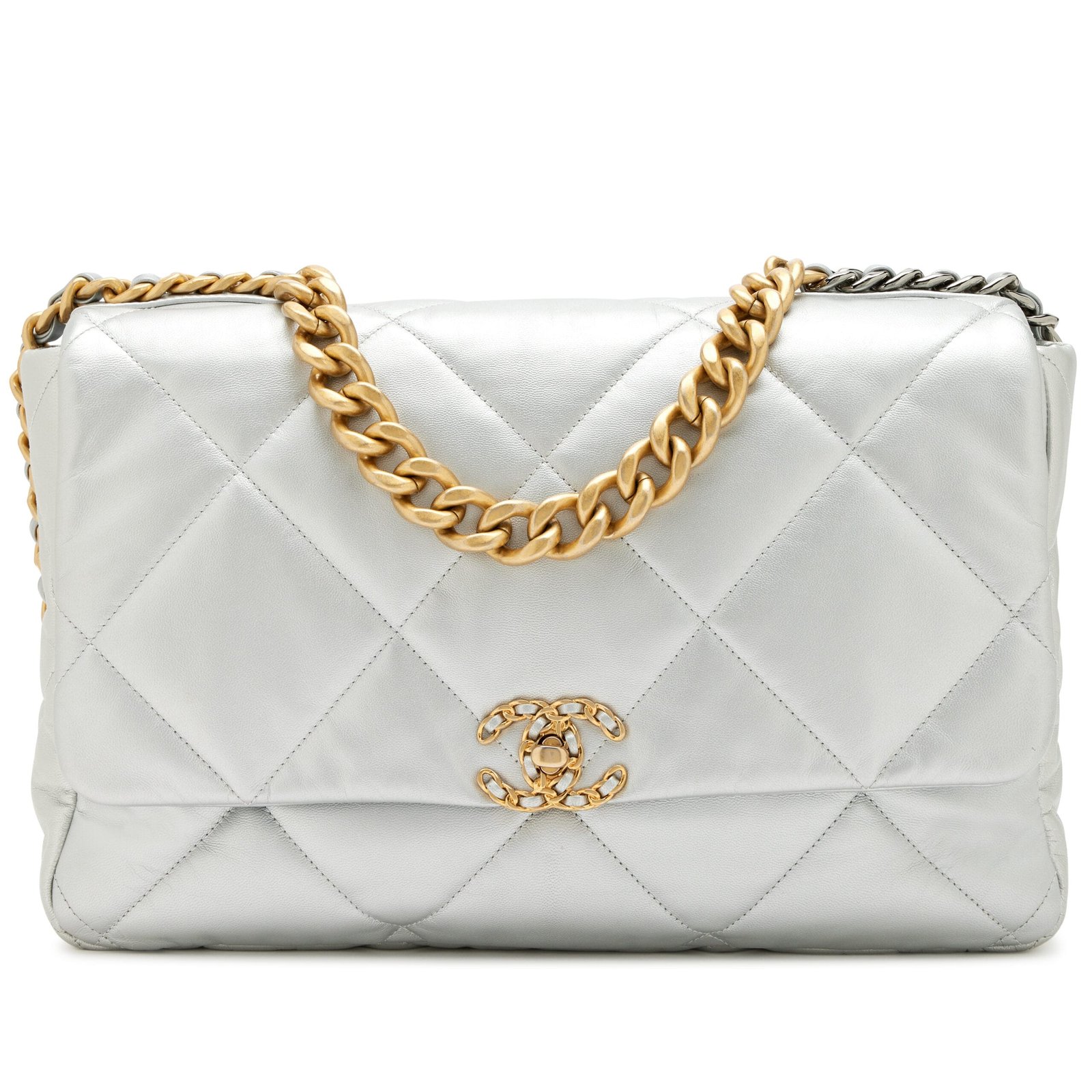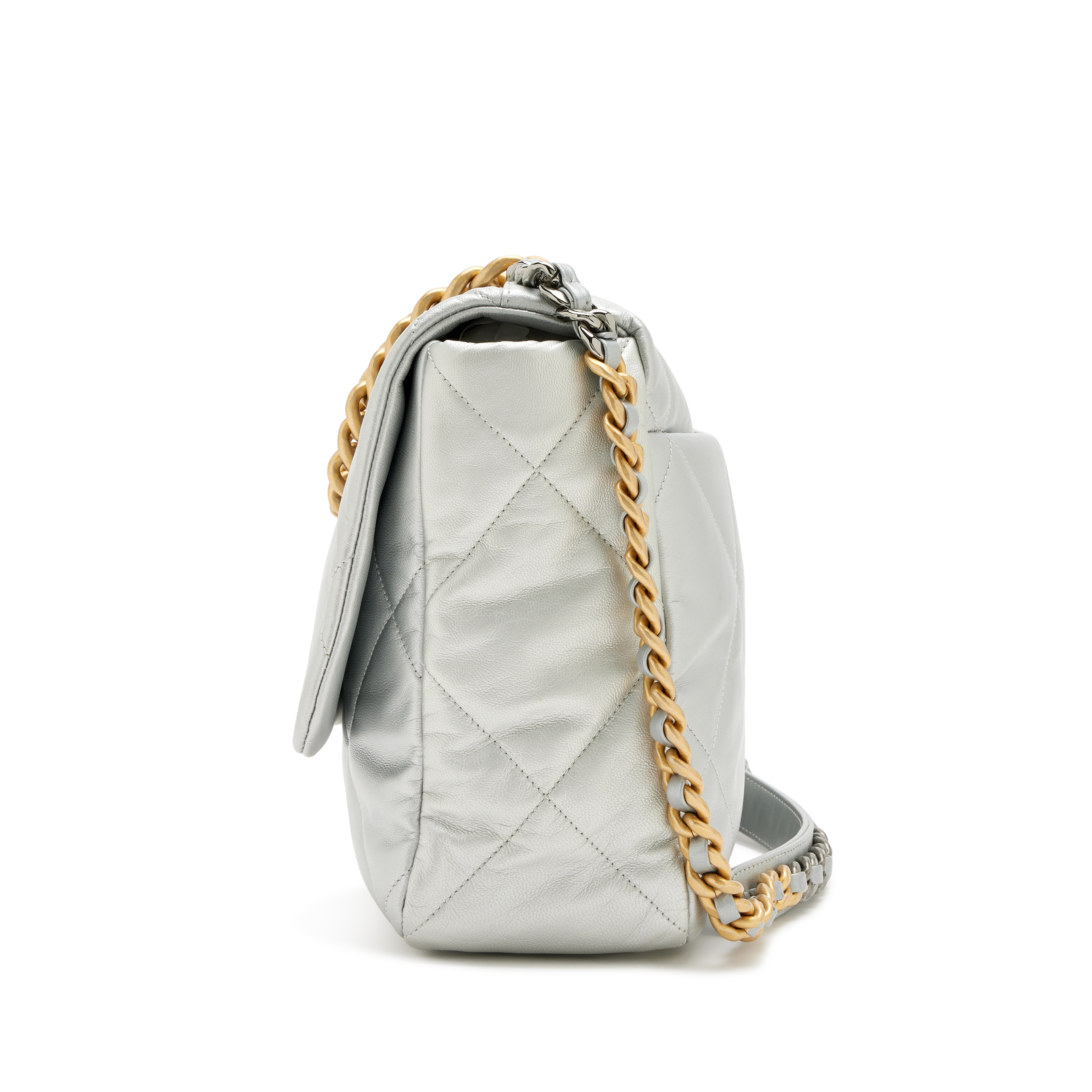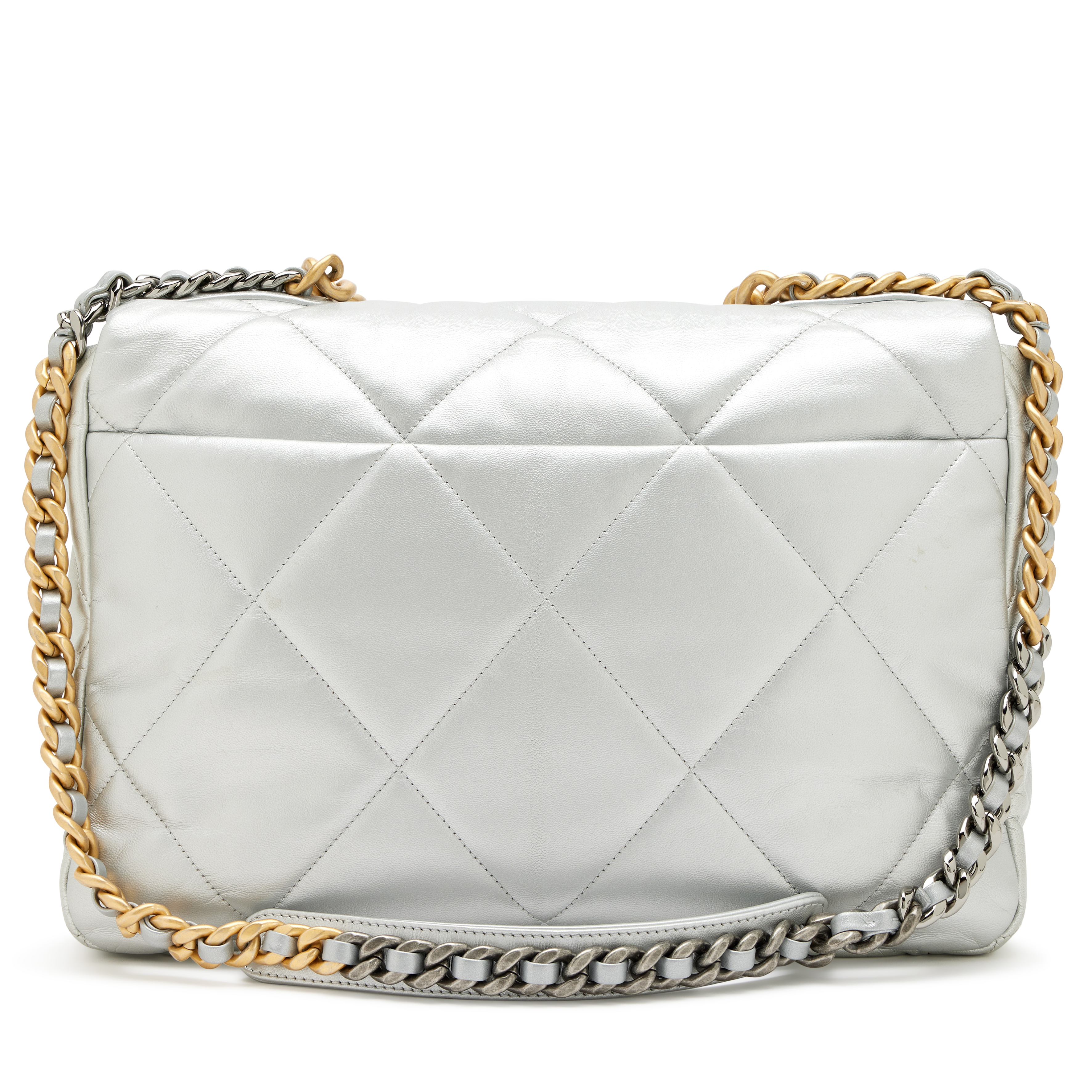 Chanel Metallic Silver Quilted Goatskin Maxi 19 Flap Bag Mixed Hardware, 2020The interior is lined in a tonal textile materialIncludes authenticity card, dust bag, and boxThis item is final sale and not eligible for return