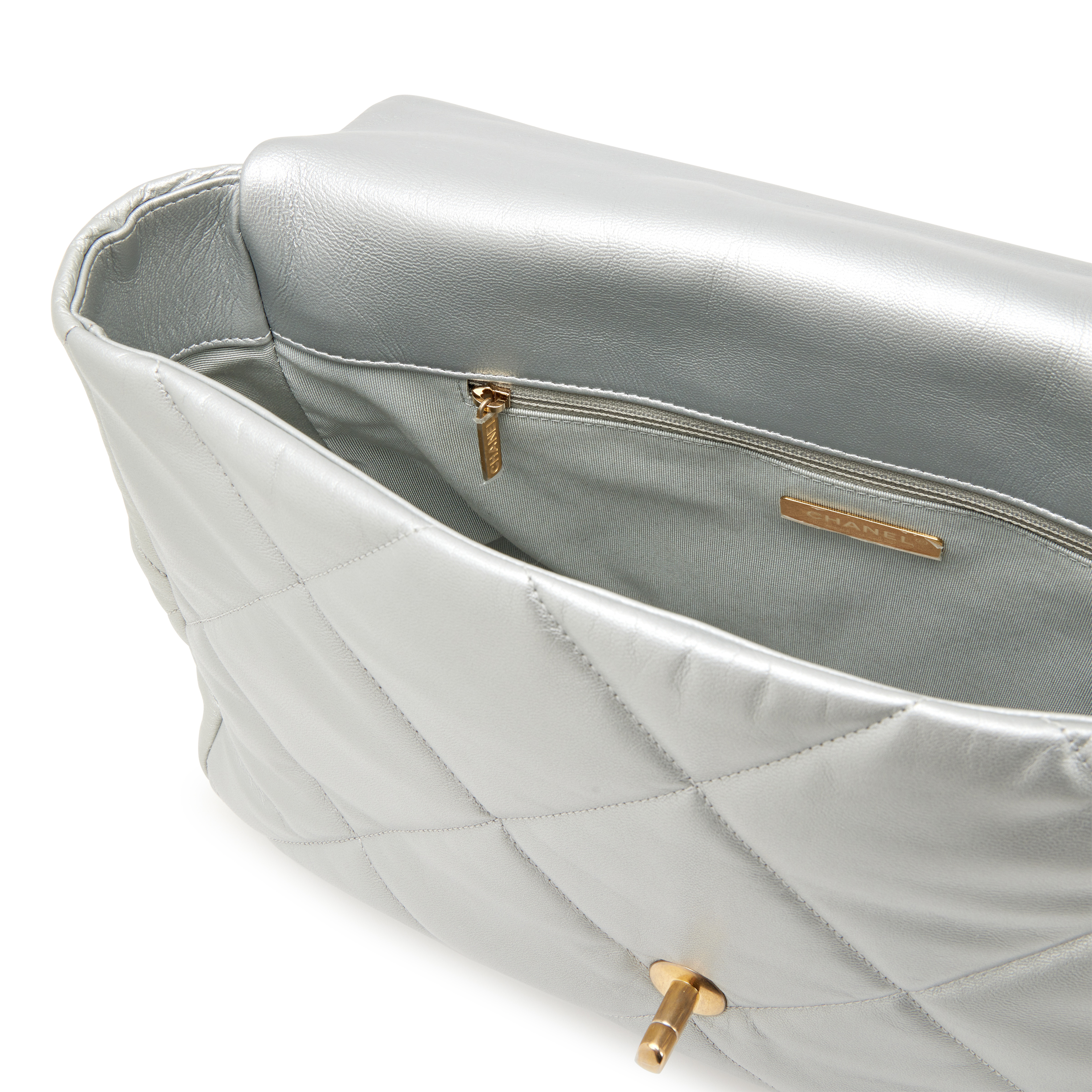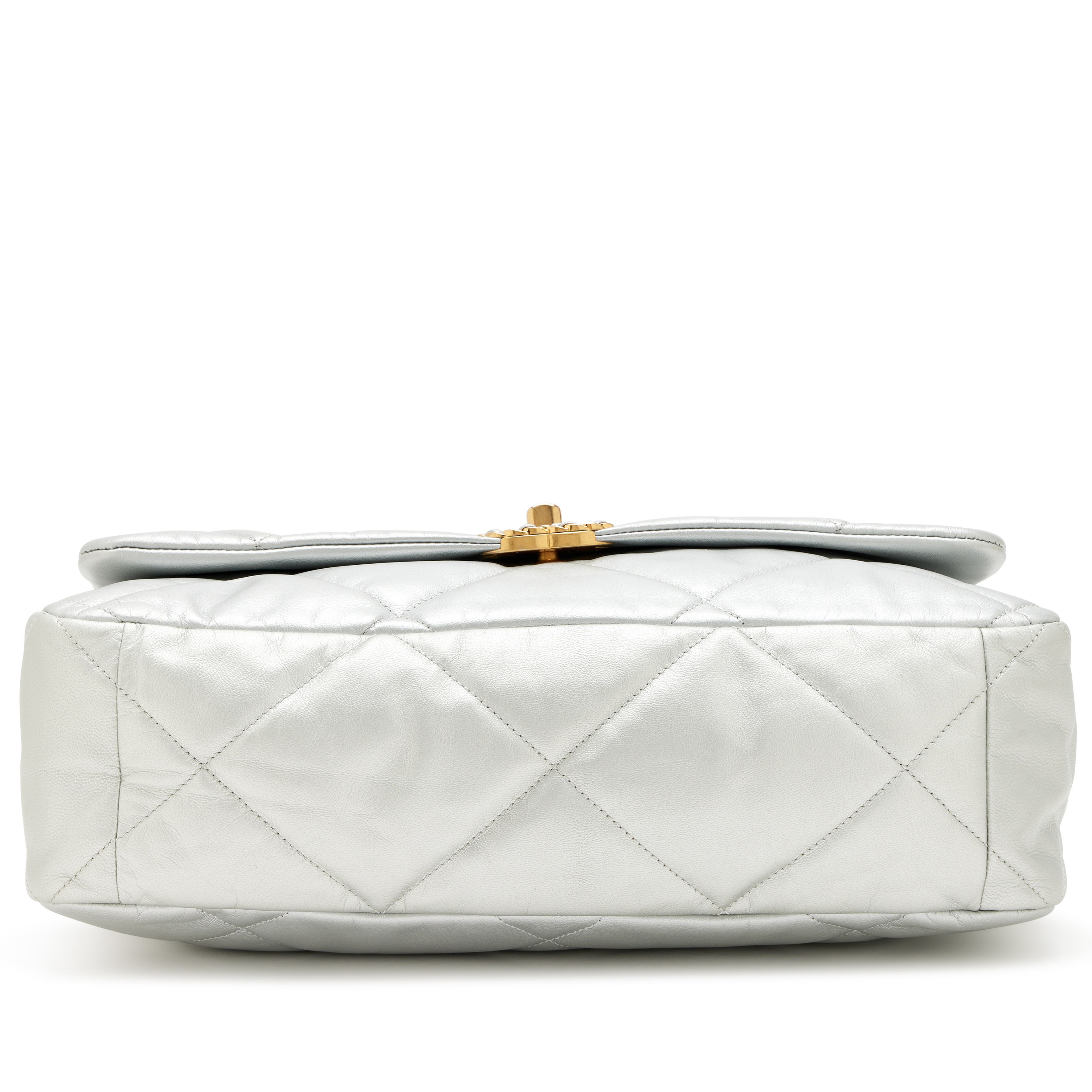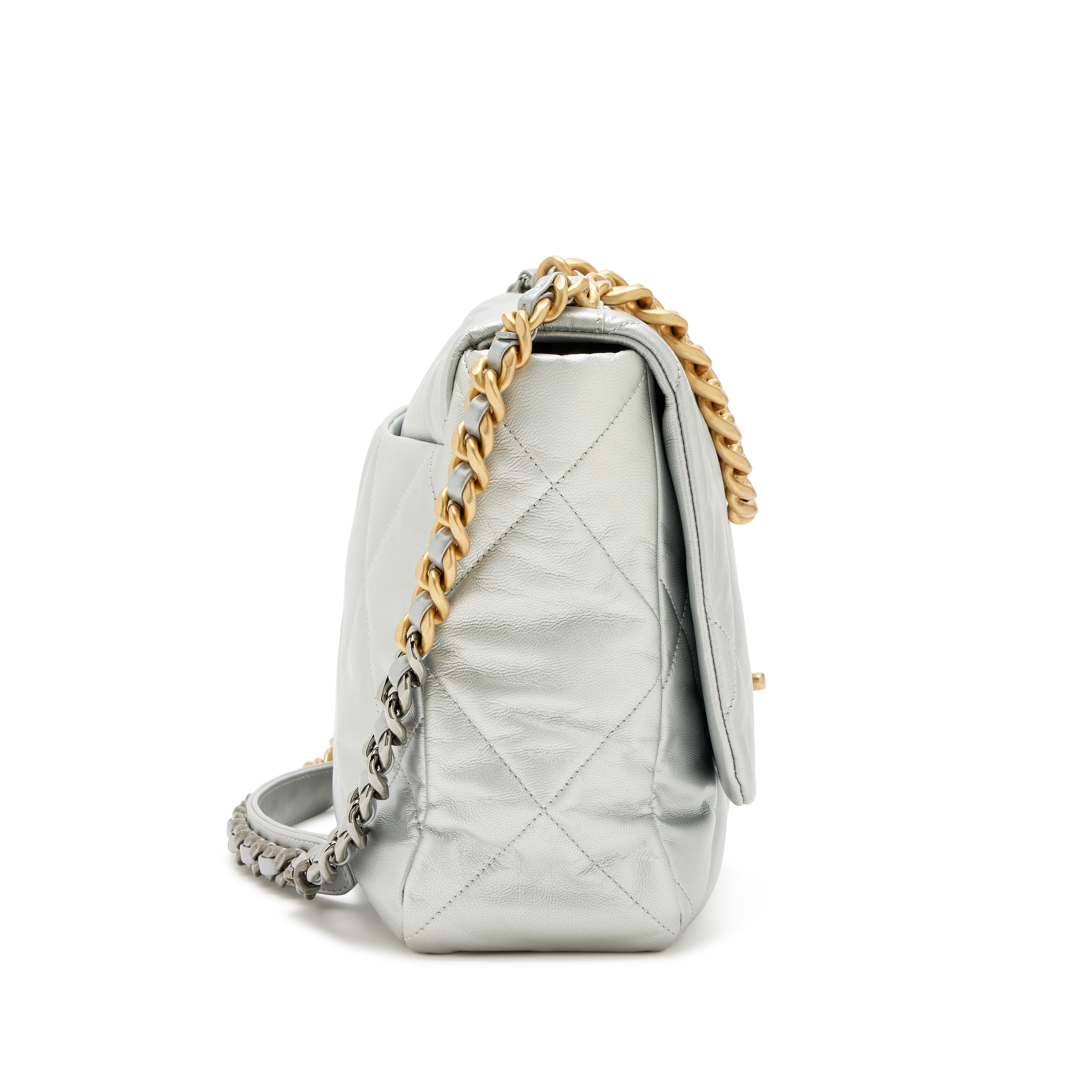 Chanel Metallic Silver Quilted Goatskin Maxi 19 Flap Bag Mixed Hardware, 2020The interior is lined in a tonal textile materialIncludes authenticity card, dust bag, and boxThis item is final sale and not eligible for return