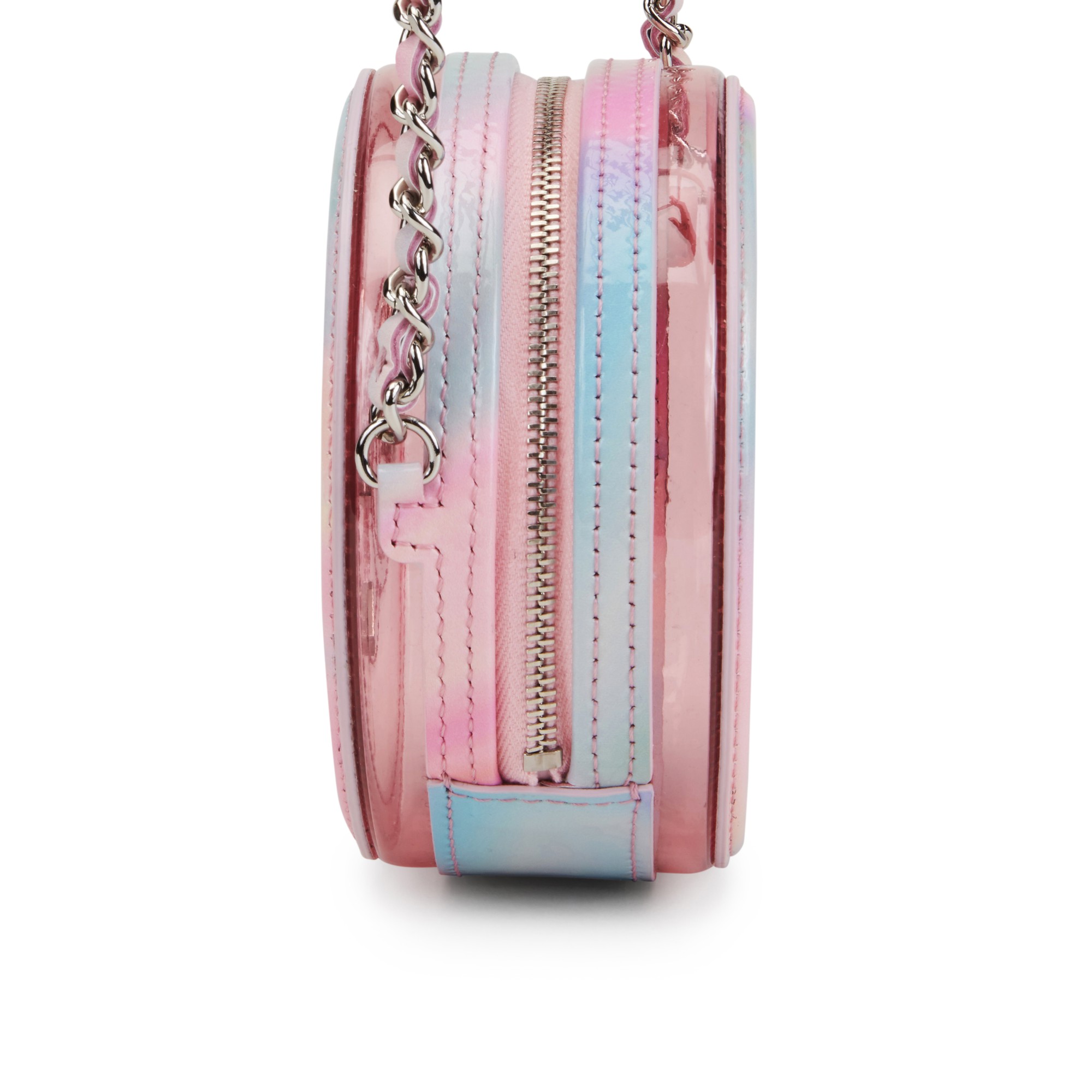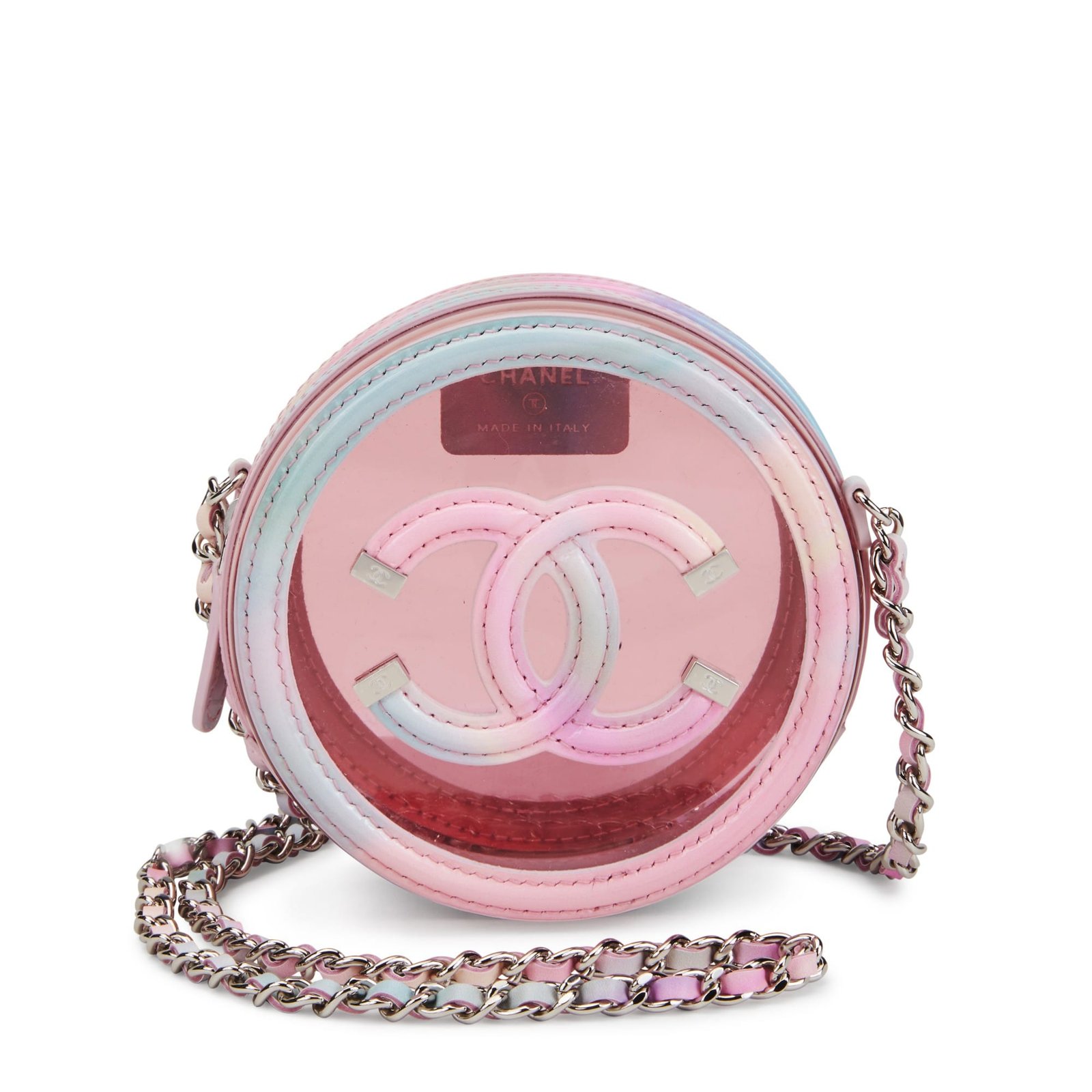 Chanel Multicolor Patent Calfskin and PVC Filigree Round Clutch with Chain Silver Hardware, 2020This piece was featured in the Cruise 2020 collectionThe interior is lined in tonal calfskin leather and PVCIncludes authenticity card, original tag, dustbag, care card, ribbon, camellia flower, and boxDimensions: 12 w x 12 h x 5.5 d cmThis item is final sale and not eligible for return