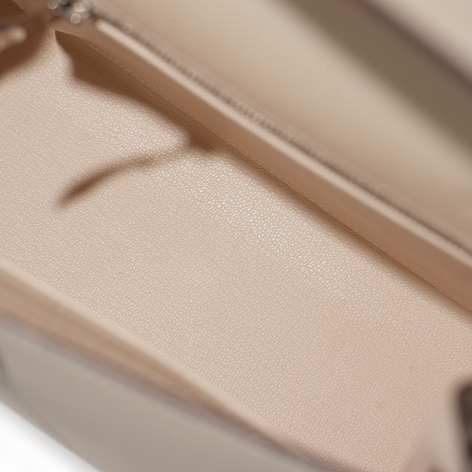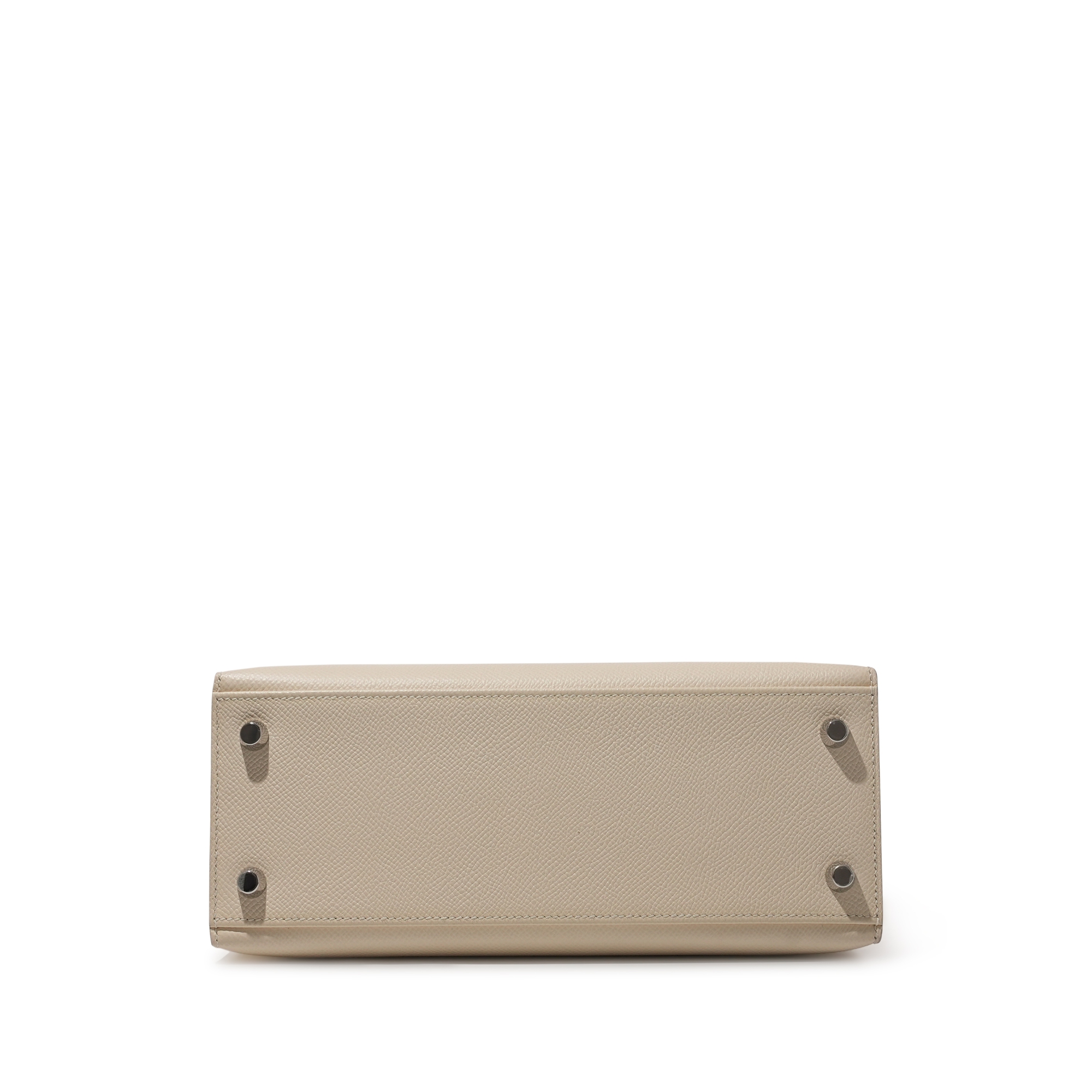 This Tri-Color Kelly, in the Sellier style, is in Nata, Chai and Gris Meyer epsom leather with palladium hardware and has tonal stitching, front flap, two straps with center toggle closure, clochette with lock and two keys, single rolled handle and removable shoulder strap.