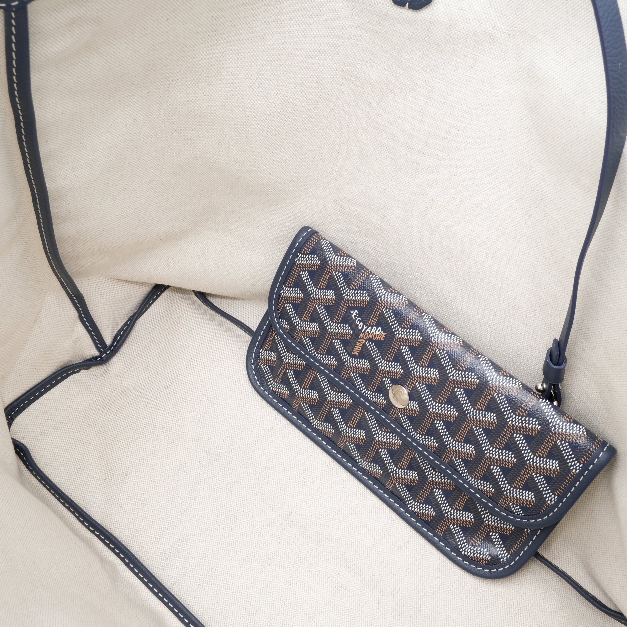 Goyard Navy Blue Goyardine Canvas and Chevroches Calfskin Saint Louis PM ToteThe interior is unlinedIncludes detachable pouch, care booklet and dust bagThis item is final sale and not eligible for return