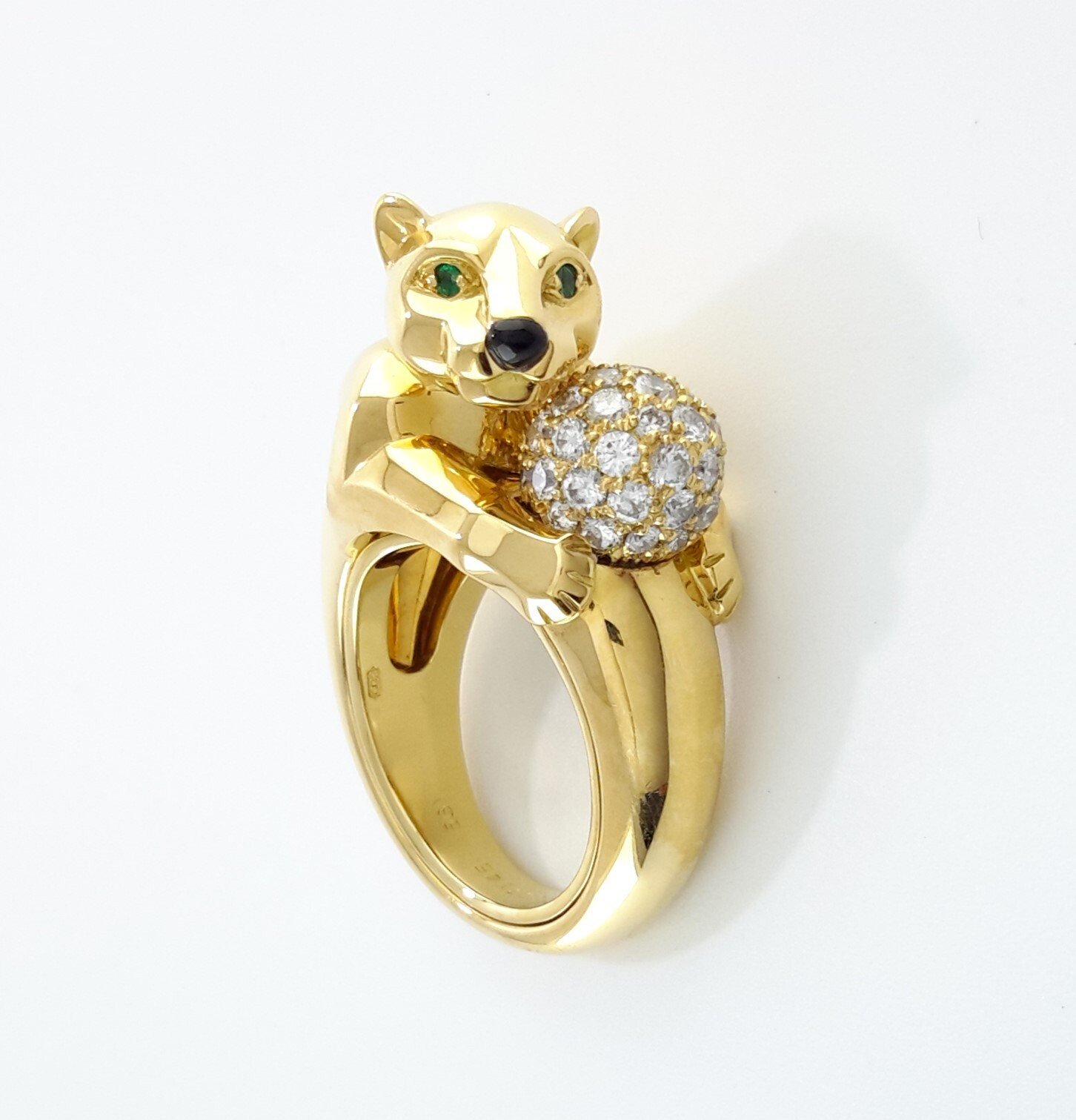 | This lovely yellow gold authentic Panthere De Cartier ring has a playful panther with emerald eyes holding a diamond set orb. This ring is pre-owned and in beautiful condition.