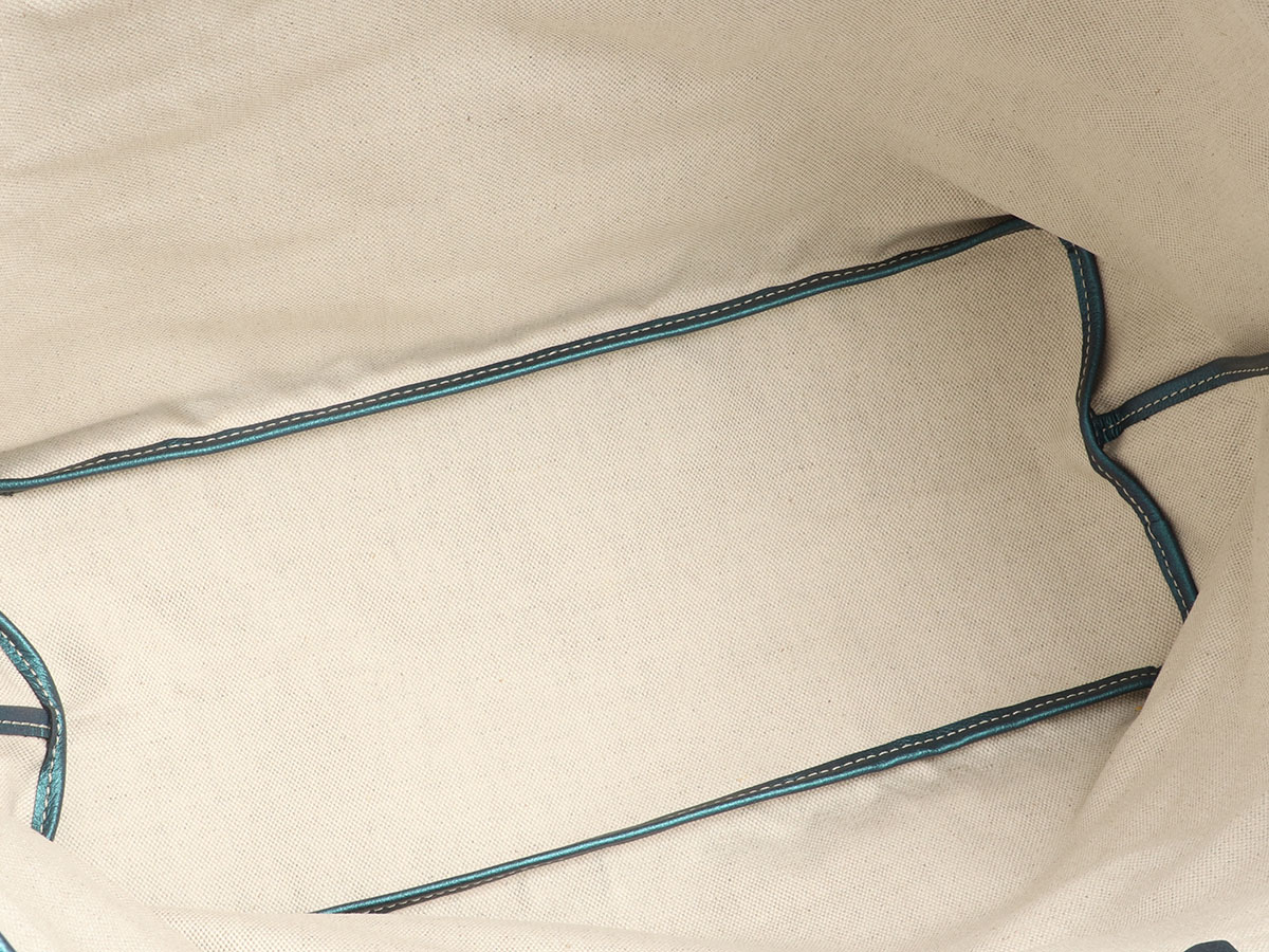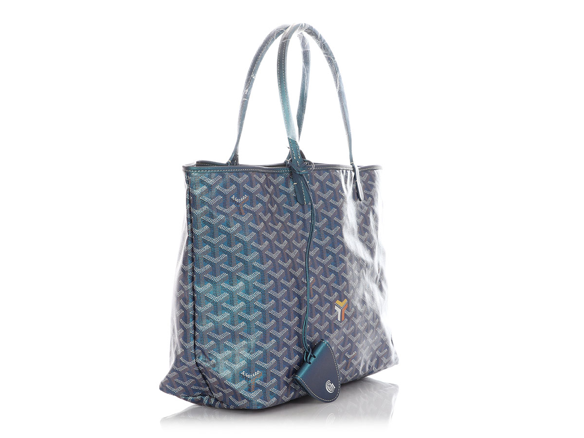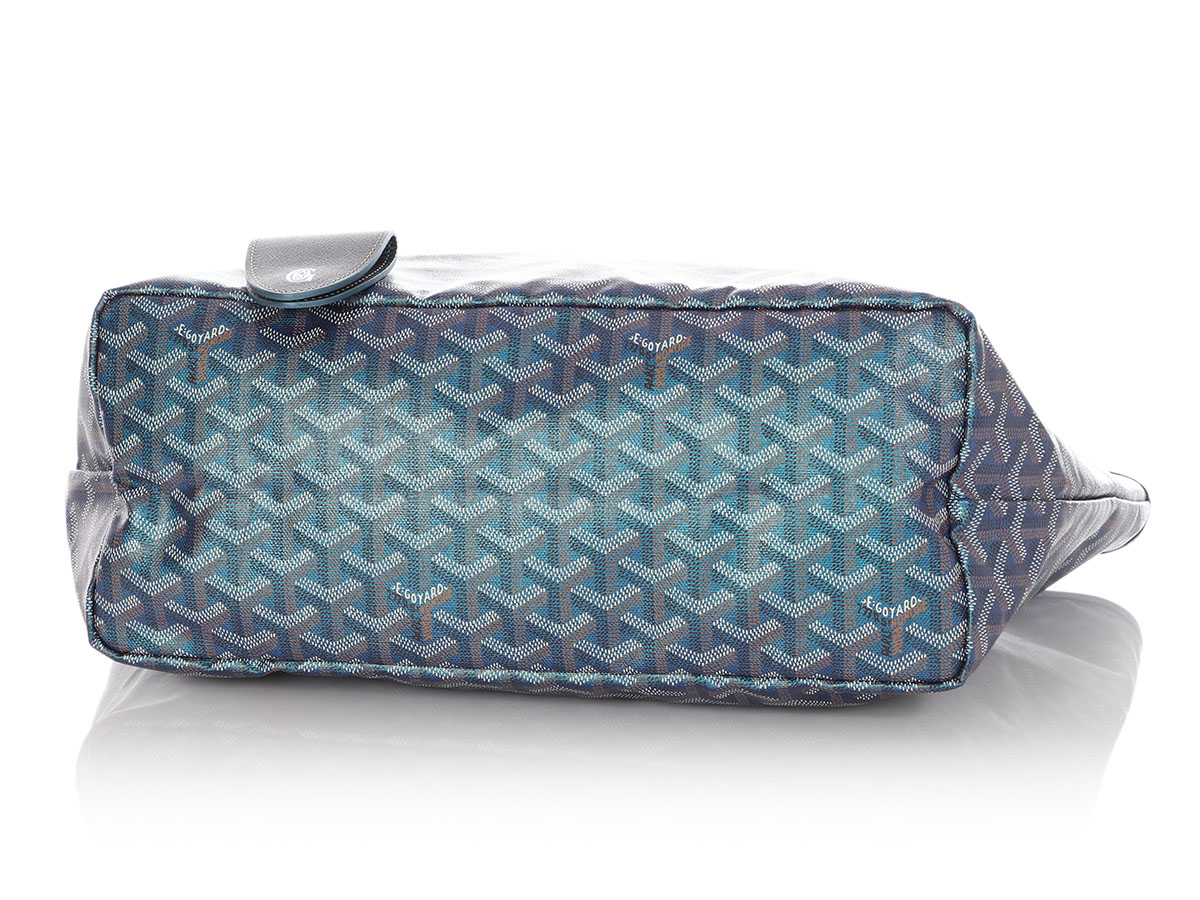 This 2024 Limited Edition Goyard Saint Louis PM tote is in iridescent pearly blue Goyardine coated canvas and iridescent blue chevroches calfskin leather trim with palladium hardware, contrast stitching, and has a matching detachable button closure wallet and a removable magnetic fastening snap. Goyard pearly blue goyardine canvas and chevroches calfskin saint louis pm tote, 2024 available for immediate sale at Uni Lux. Includes detachable pouch, care booklet and dust bag.