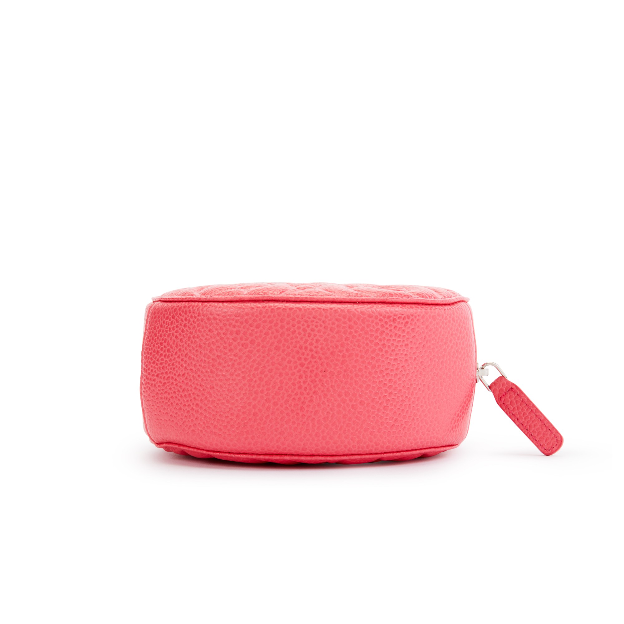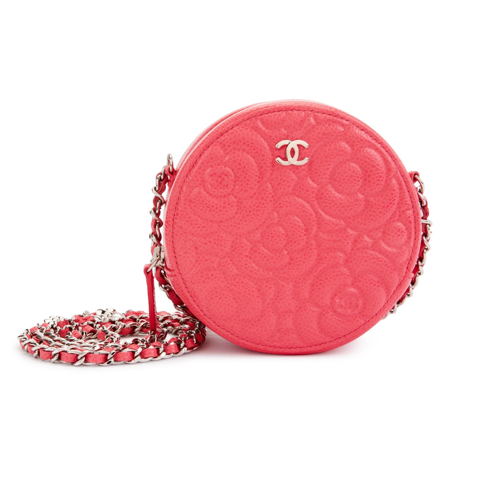 Chanel Pink Camellia Embossed Grained Calfskin Round Chain Clutch Silver Hardware, 2020The interior is lined in tonal textile materialIncludes authenticity card, dustbag, camellia flower, and boxDimensions: 12 w x 12 h x 5.5 d cmThis piece is final sale and not eligible for return