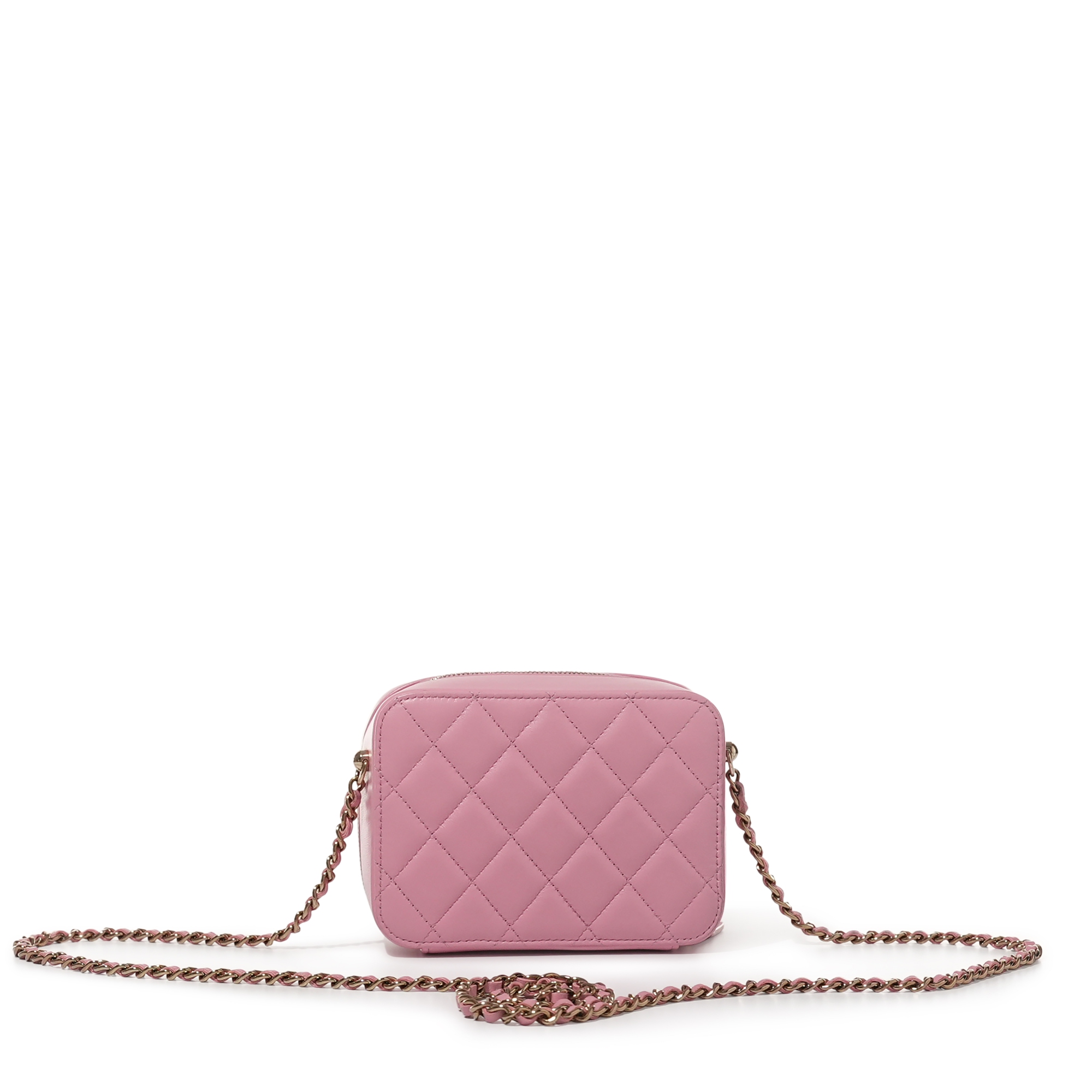 Chanel Pink Lambskin Camera Case Pale Gold Hardware, 2022The interior is lined with tonal textile materialIncludes dust bag and boxThis item is final sale and not eligible for return