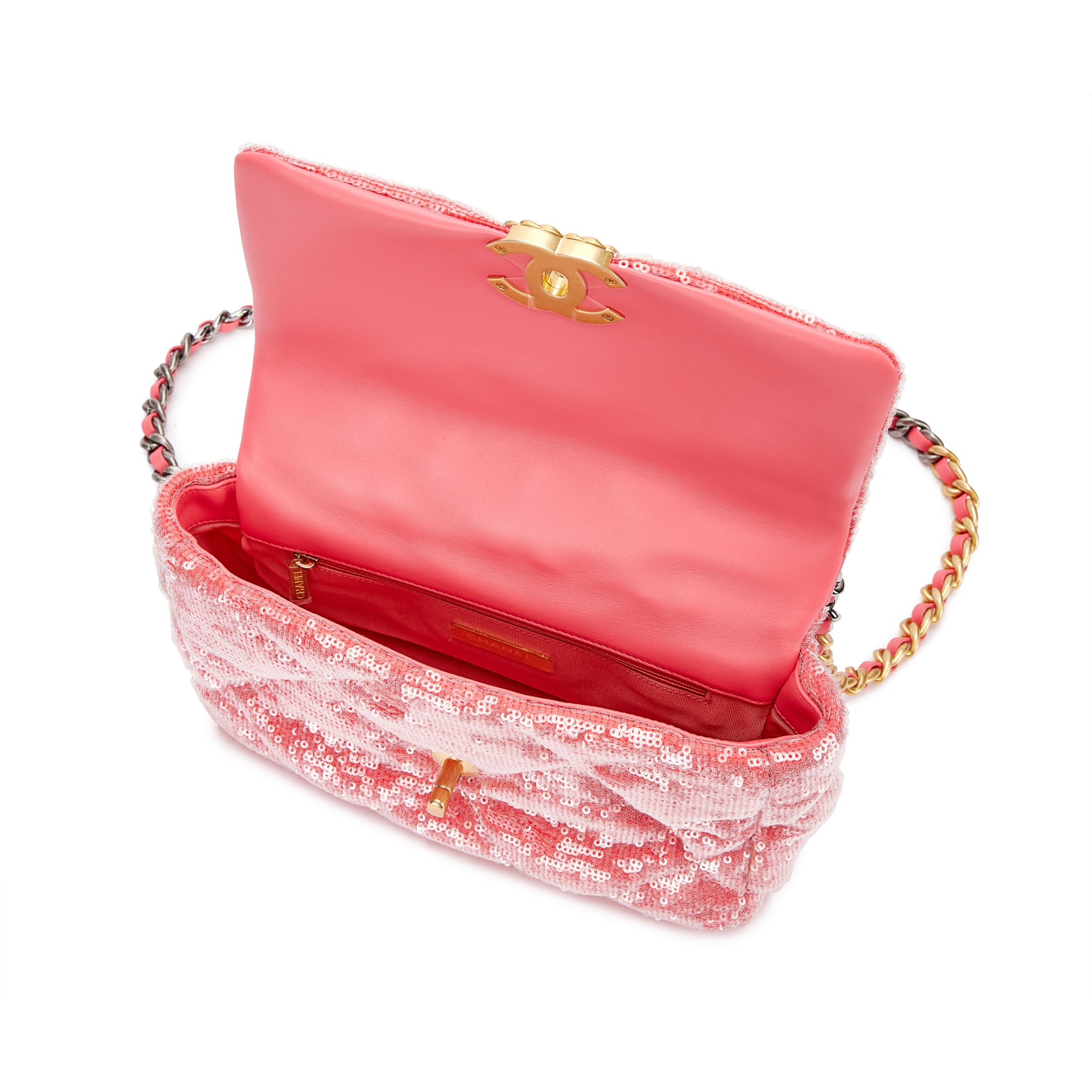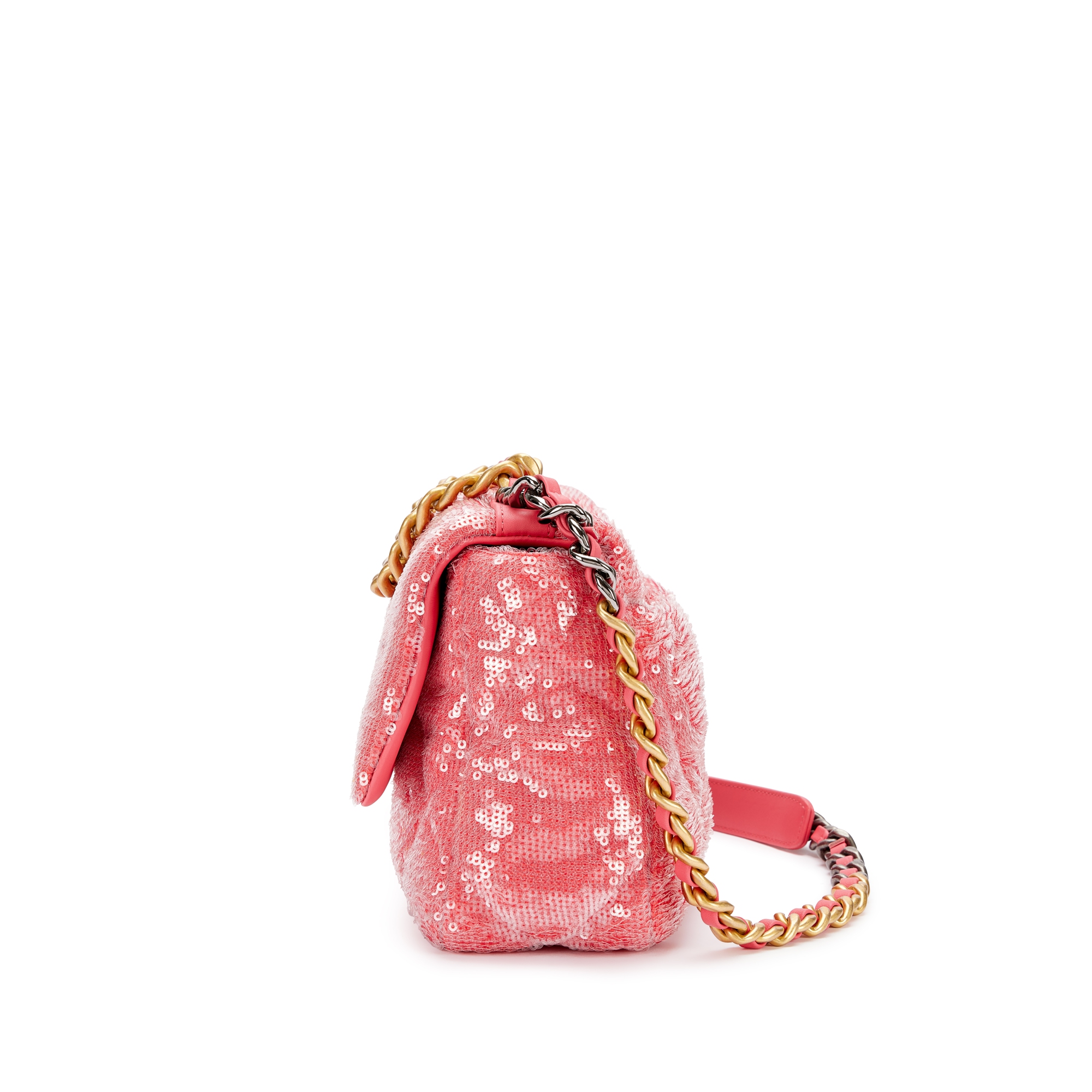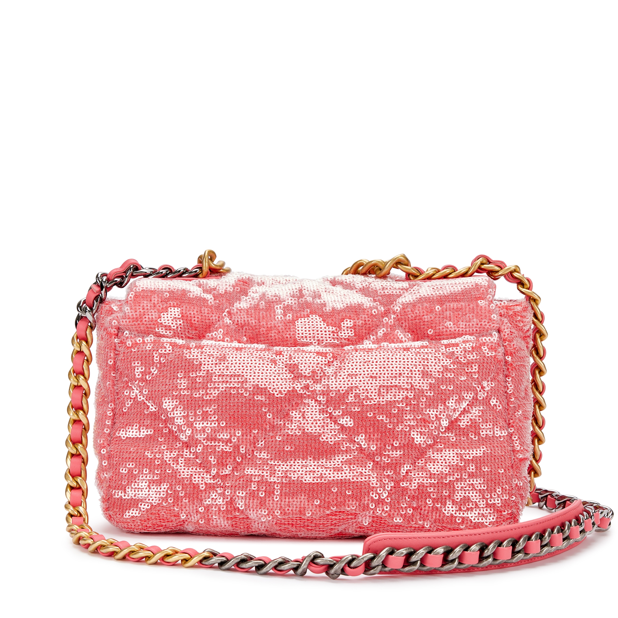 Chanel Pink Quilted Sequin Chanel 19 Flap Brushed Gold, Silver and Ruthenium Hardware, 2020The interior is lined with tonal textile materialIncludes felt, authenticity card and dust bagThis item is final sale and not eligible for return