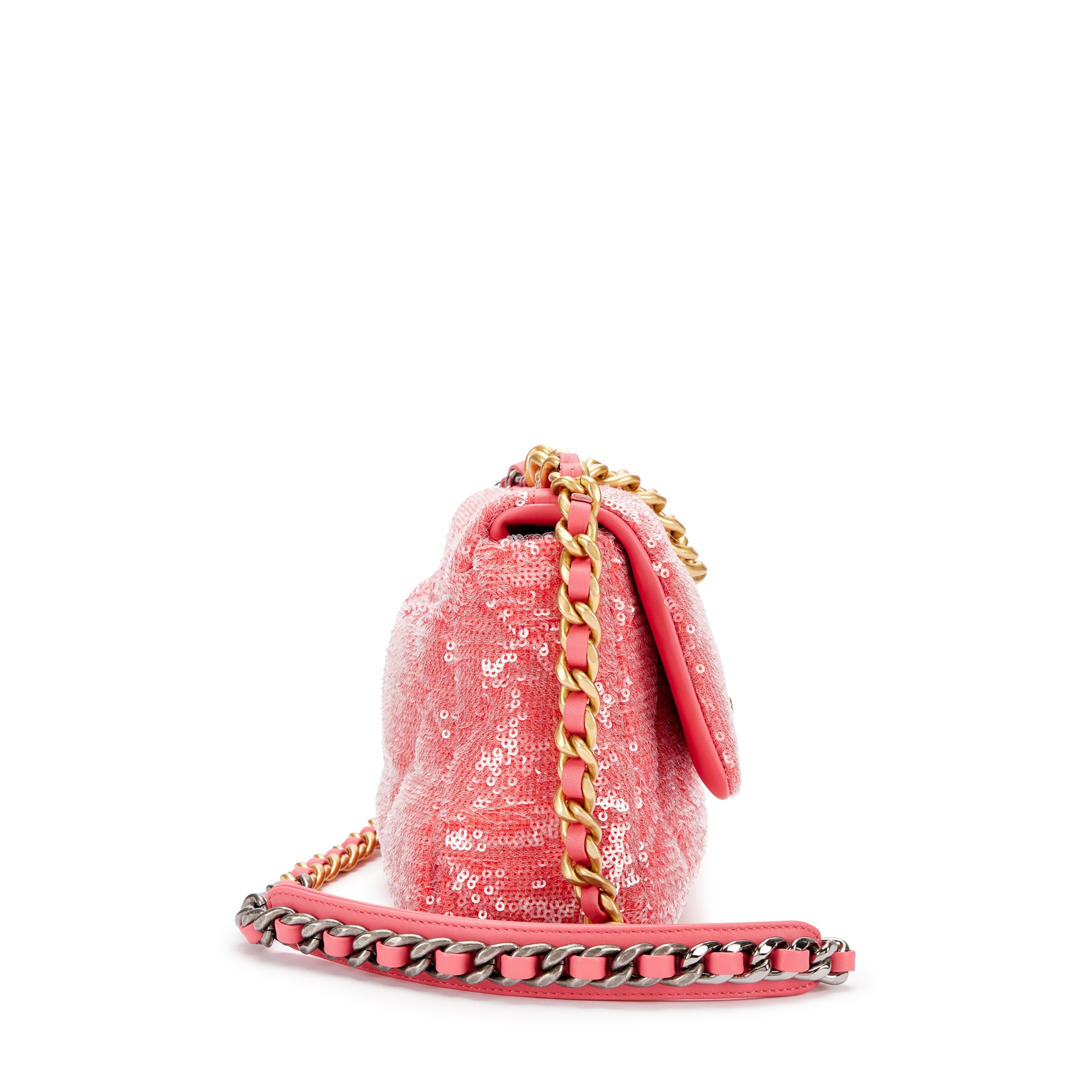 Pink Quilted Sequin Chanel 19 Flap Brushed Gold, Silver and Ruthenium Hardware, 2020