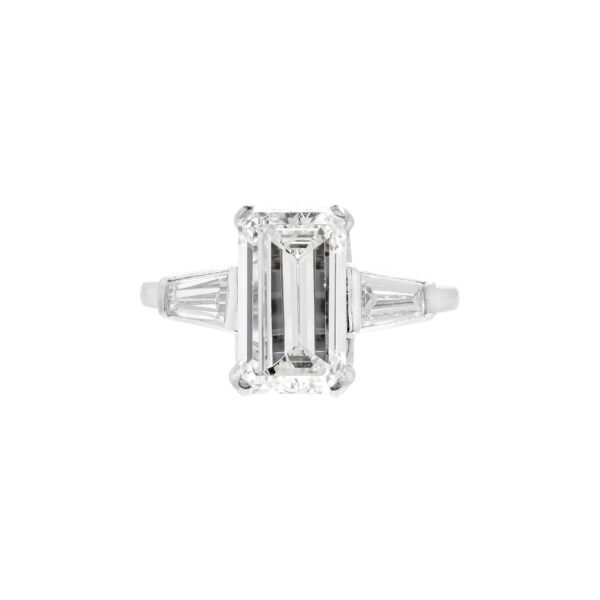 Centering an emerald-cut diamond and accented by tapered baguette-cut diamonds.Emerald-cut diamond weighing 3.08 caratsAdditional diamonds weighing a total of approximately 0.45 caratPlatinumTotal weight 5.48 gramsSize 6Accompanied by GIA report no. 2221915723, dated 24 April 2023, stating that the 3.08 carat diamond is H color and VS1 clarity with no fluorescenceThis item is final sale and not eligible for return