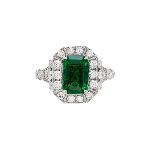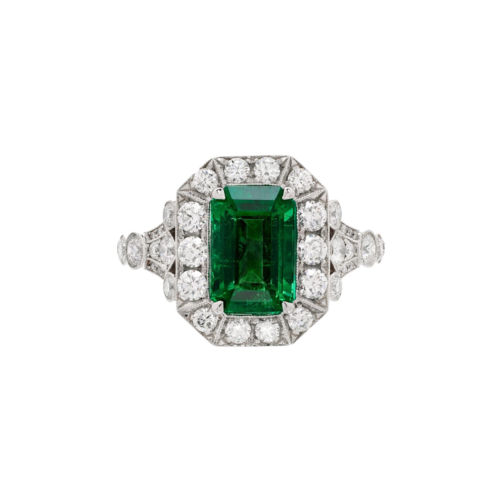 Centering an emerald cut Zambian emerald, accented by round brilliant cut diamonds.Zambian emerald weighing 3.86 caratsDiamonds weighing a total of approximately 1.45 caratsPlatinumTotal weight 12.43 gramsSize 7¼Accompanied by AGL report no. CS 45181, dated 22 June 2011, stating that the 3.86 carat emerald is Zambian origin and shows No Clarity Enhancement