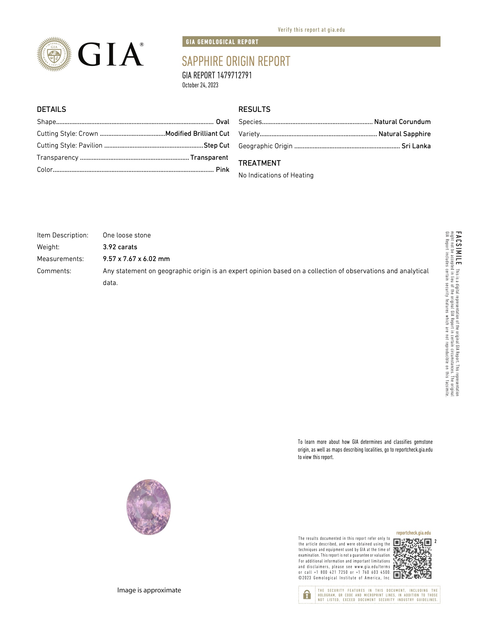 Centering an oval-shaped pink sapphire, surrounded by round brilliant-cut diamonds and baguette-cut diamonds.Pink sapphire weighing 3.92 caratsDiamonds weighing a total of 0.89 caratStamped diamond carat total weightPlatinumTotal weight 7.48 gramsSize 6½Accompanied by GIA report no. 1479712791, dated 24 October 2023, stating that 3.92 carat pink sapphire is originated from Sri Lanka with no indications of heating