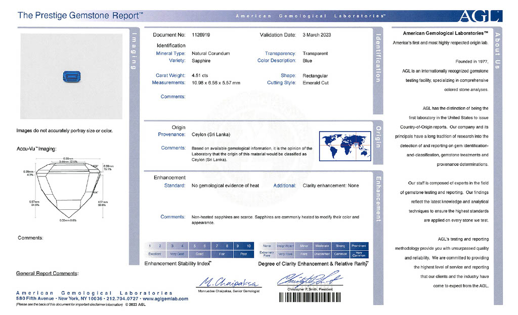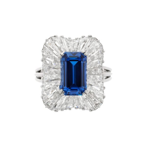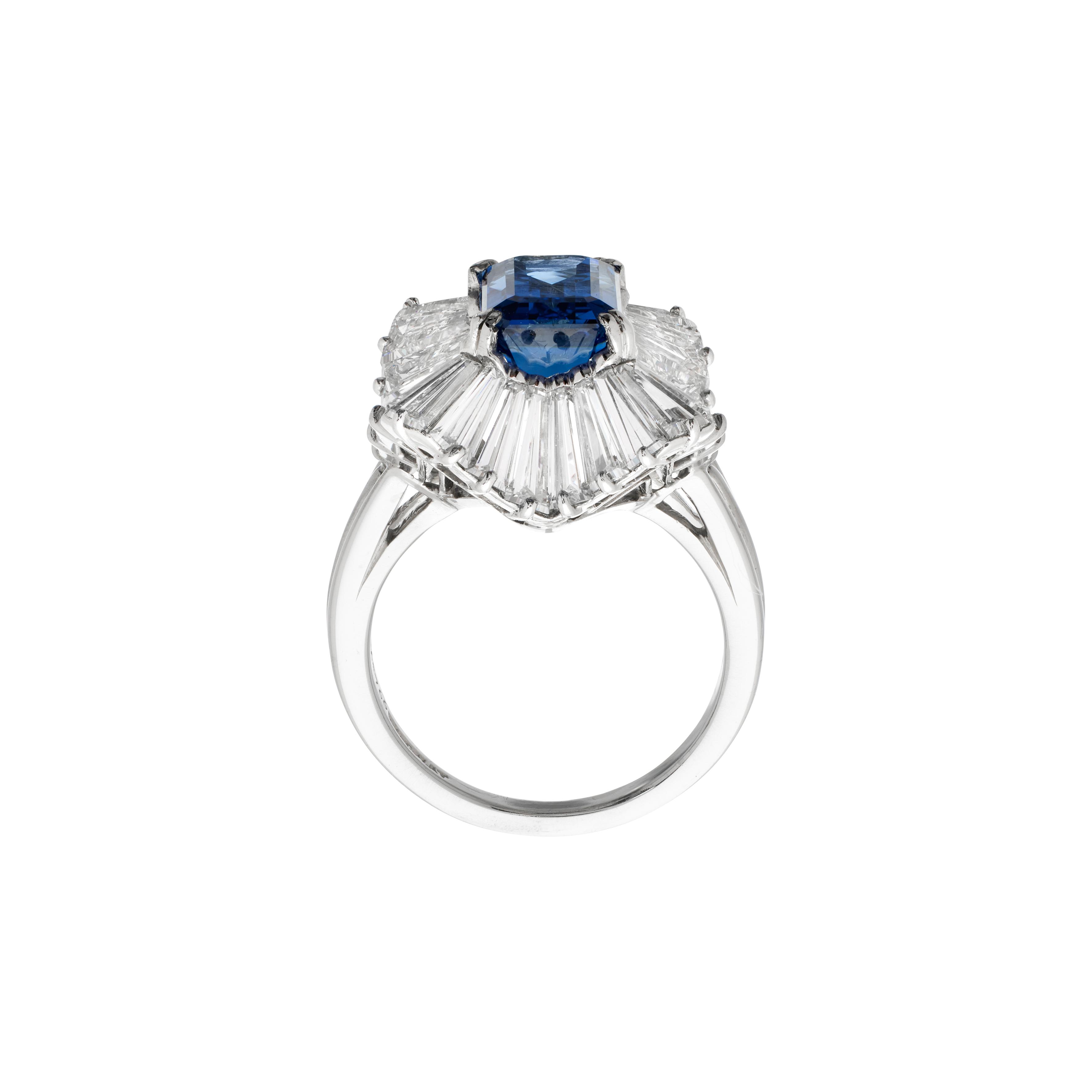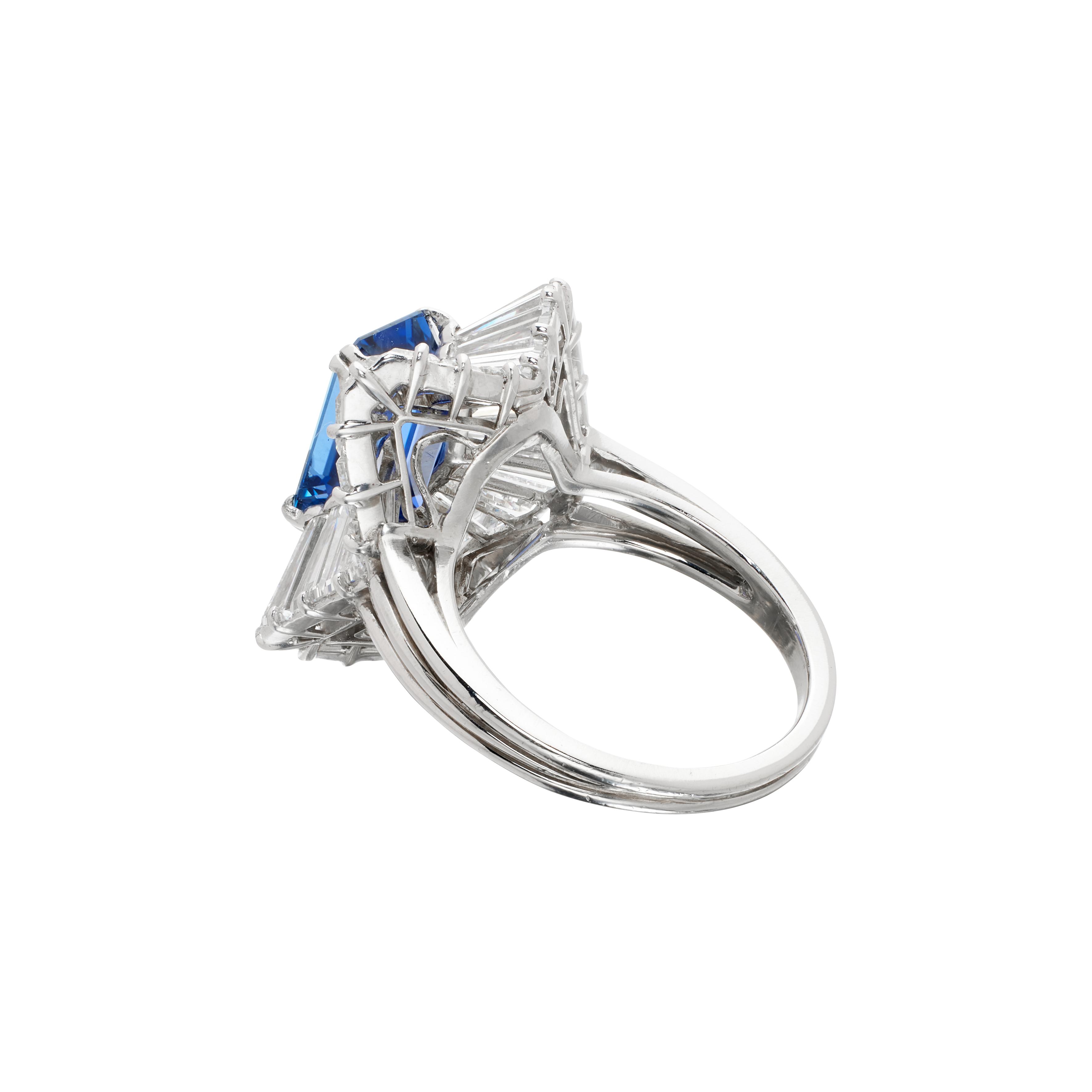 Centering an emerald cut Ceylon sapphire and accented by tapered baguette cut diamonds.Ceylon sapphire weighing 4.51 caratsDiamonds weighing a total of approximately 4.00 caratsPlatinumTotal weight 10.44 gramsSize 6½Accompanied by AGL report no. 1126919, dated 3 March 2023, stating that the 4.51 carat sapphire is Ceylon (Sri Lanka) origin and shows No Gemological Evidence of Heat