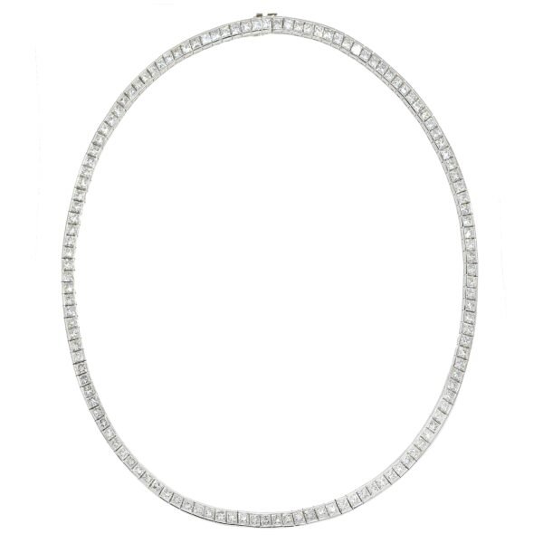 Composed of princess cut diamonds continuously set in a tennis necklace.Diamonds weighing a total of approximately 18.95 carats, averaging 0.15 carat eachPlatinumTotal weight 66.96 gramsLength 16½ inches, width ⅛ inch
