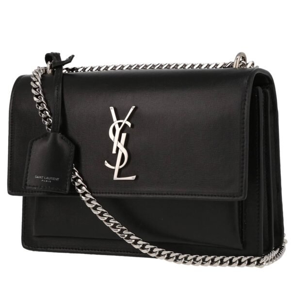 Classic medium model Saint Laurent Sunset shoulder bag in black leather, hardware in silver metal, convertible chain strap in silver metal allowing the bag to be worn on the shoulder or accross the body.