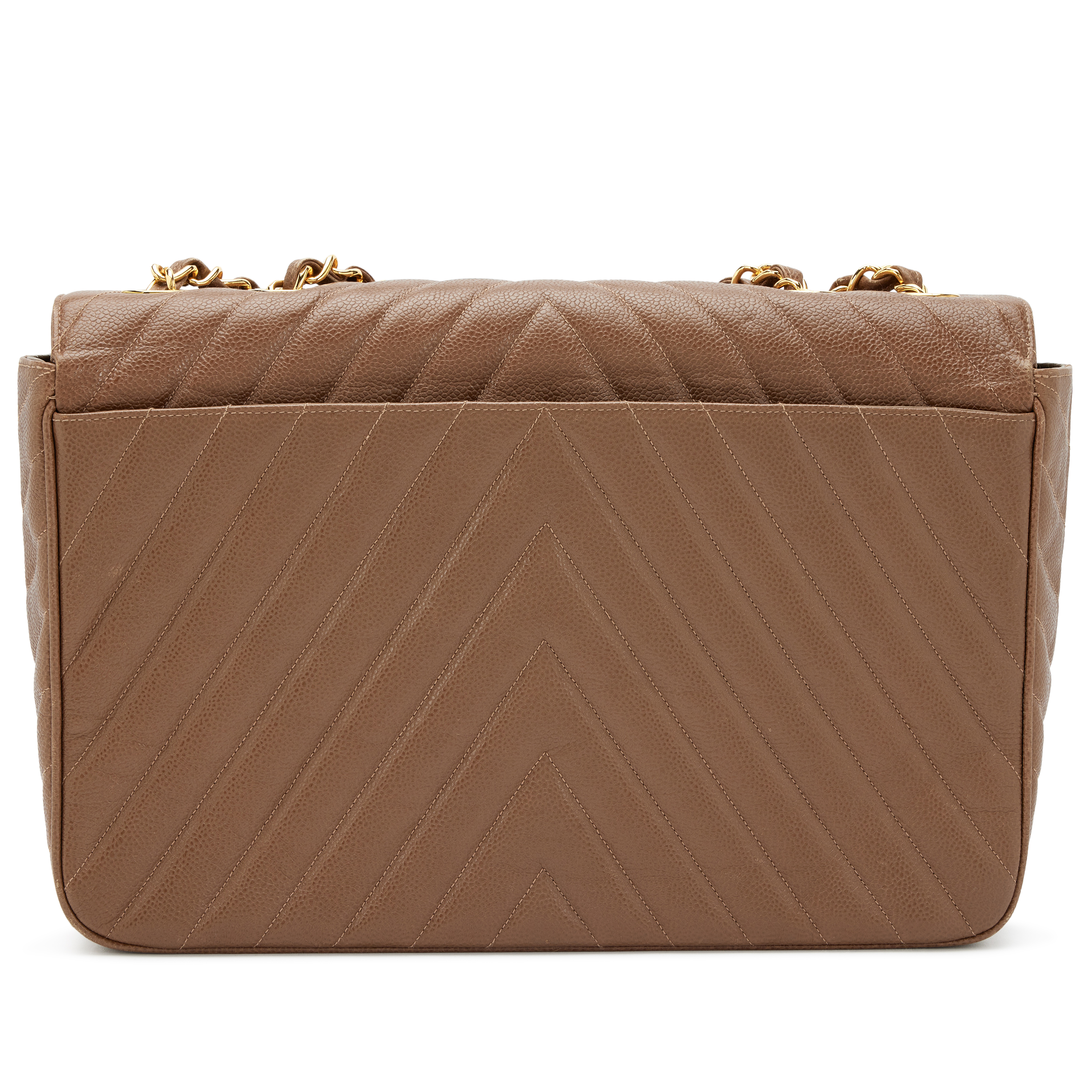 Chanel Taupe Brown Chevron Caviar Maxi Jumbo XL Classic Single Flap Bag Gold Hardware, 1991-1994The interior is lined in a tonal leatherIncludes authenticity card and dust bagThis item is final sale and not eligible for return