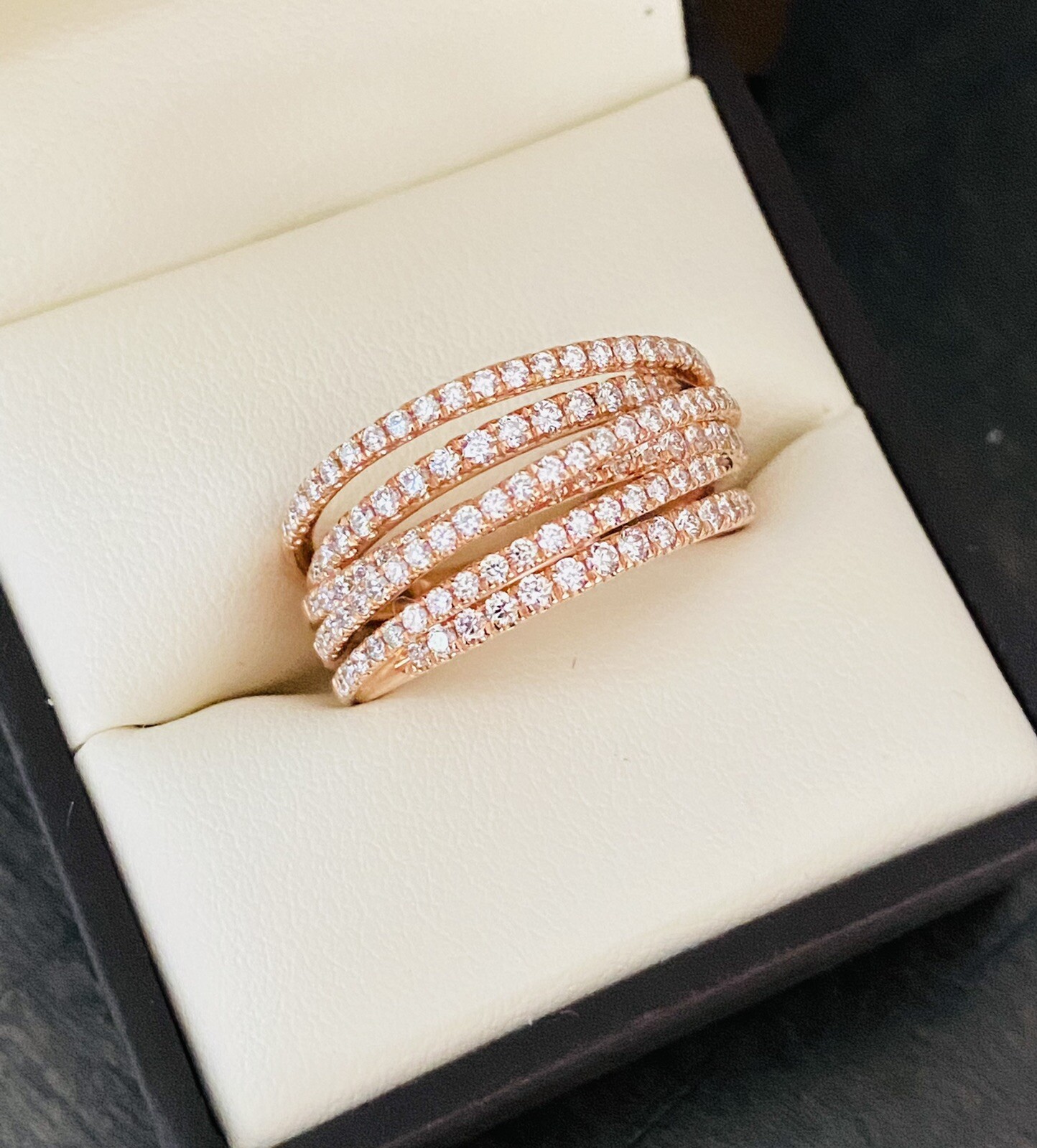 Criss crossing strands of radiant pavé diamonds garnish this layered look fashion ring. Gleaming 14K rose gold feels oh-so-modern in a graphic silhouette. Drape yourself in 1.02cts of dazzling diamonds when you choose this gorgeous ring.