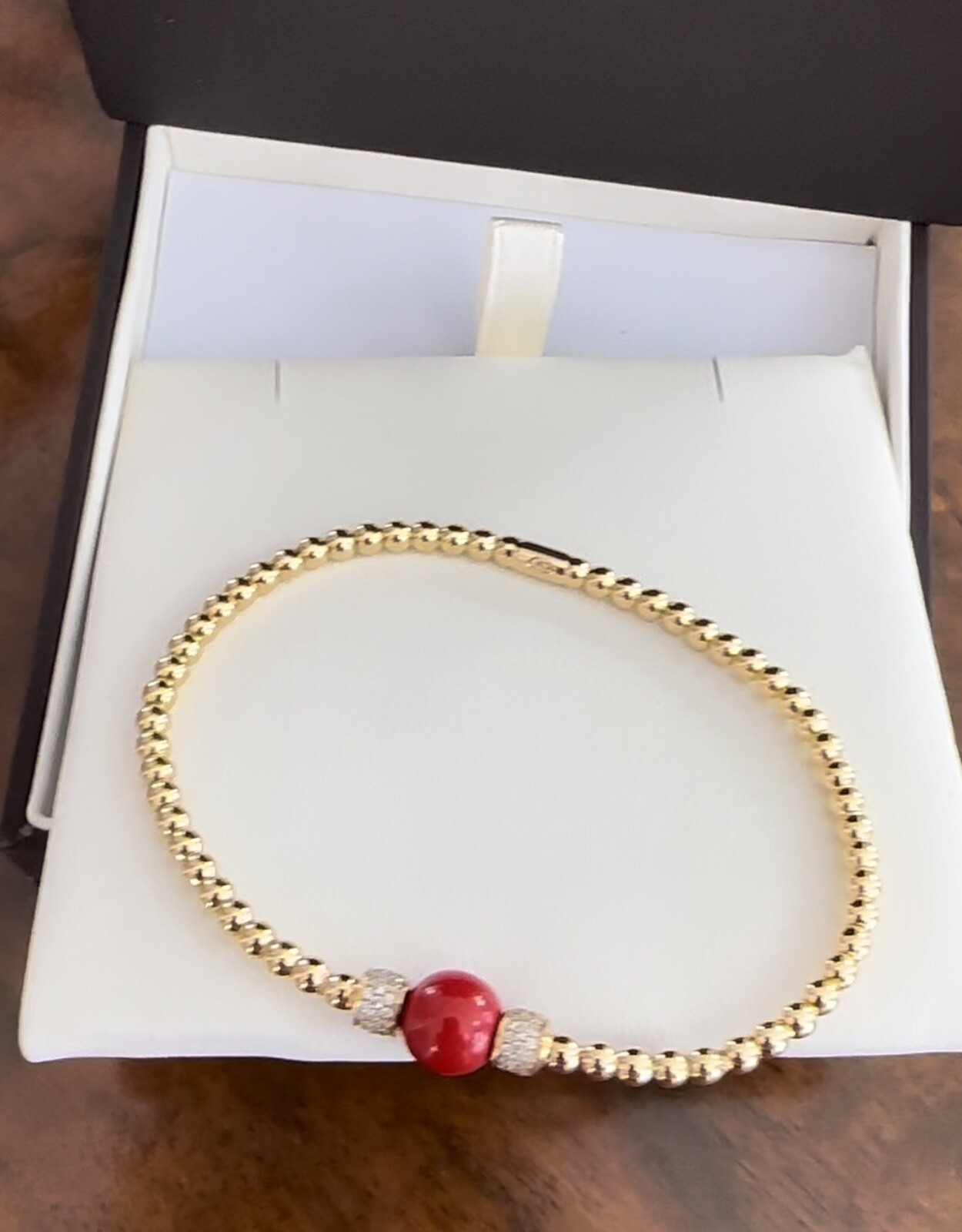 Beautiful unworn condition ladies Italian designer Platini bracelet. The elastic bracelet is beaded with solid 18k yellow gold 3mm beads and is accented with a beautiful red coral bead in the center and diamonds. Diamonds are all natural white stones. Gorgeous piece ! Thoughtfully made that when bracelet is stretched, smaller beads film in the gaps between the larger beads (see last photo) Will fit a standard size ladies wrist of 6.5 inches.