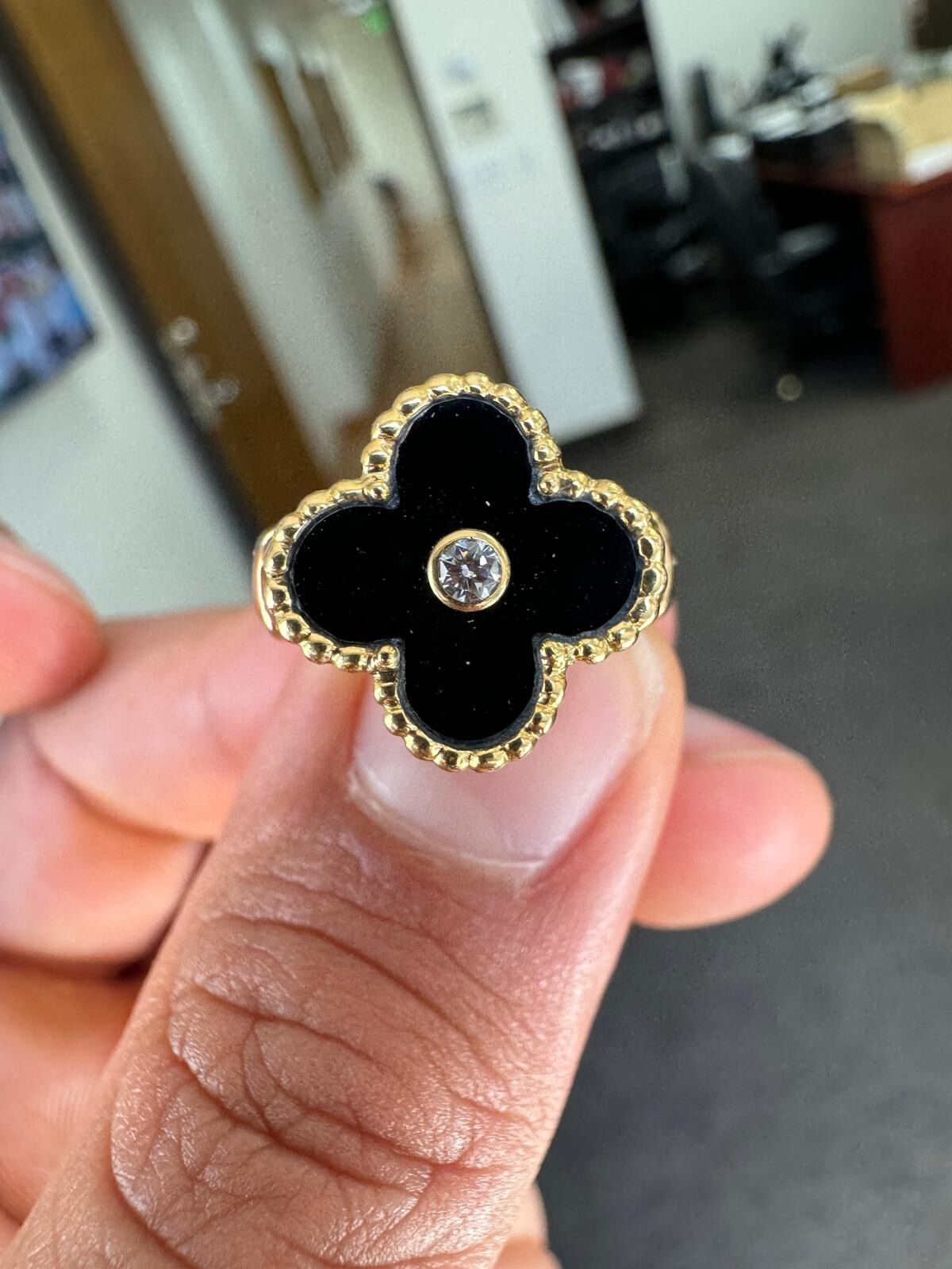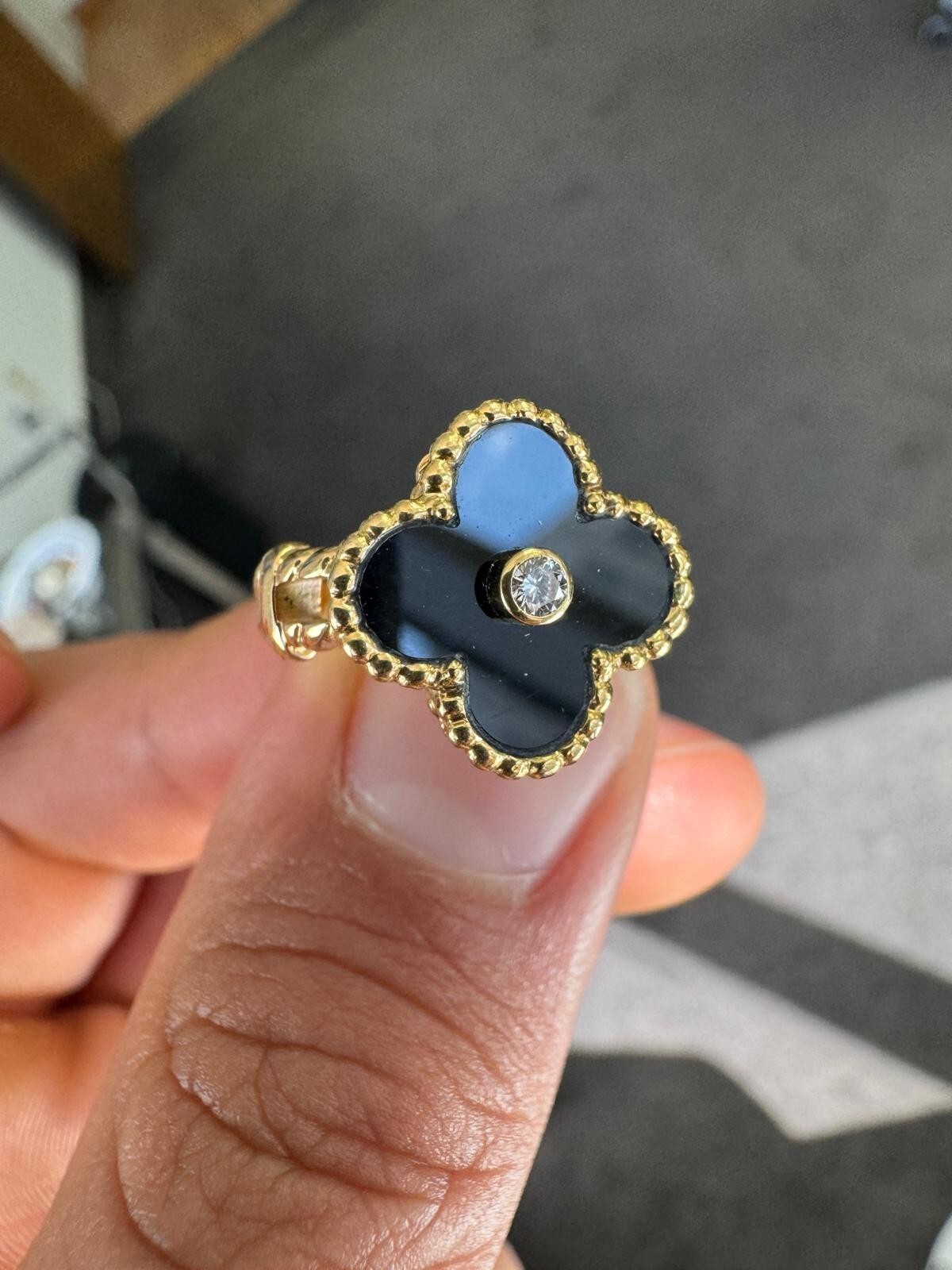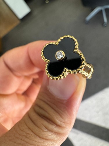 This lovely Van Cleef & Arpels Alhambra Ring has a flower charm on it with black onyx and a diamond
