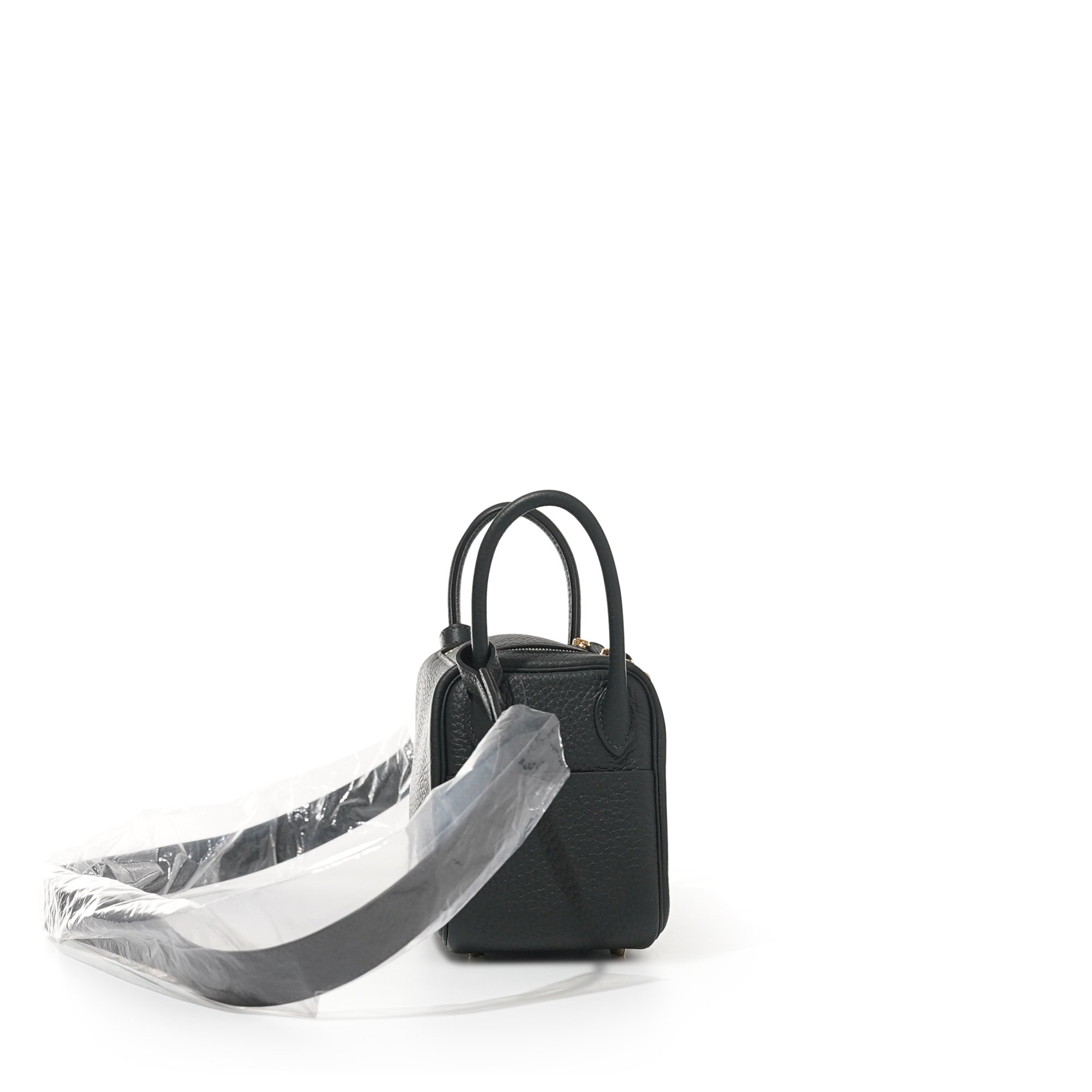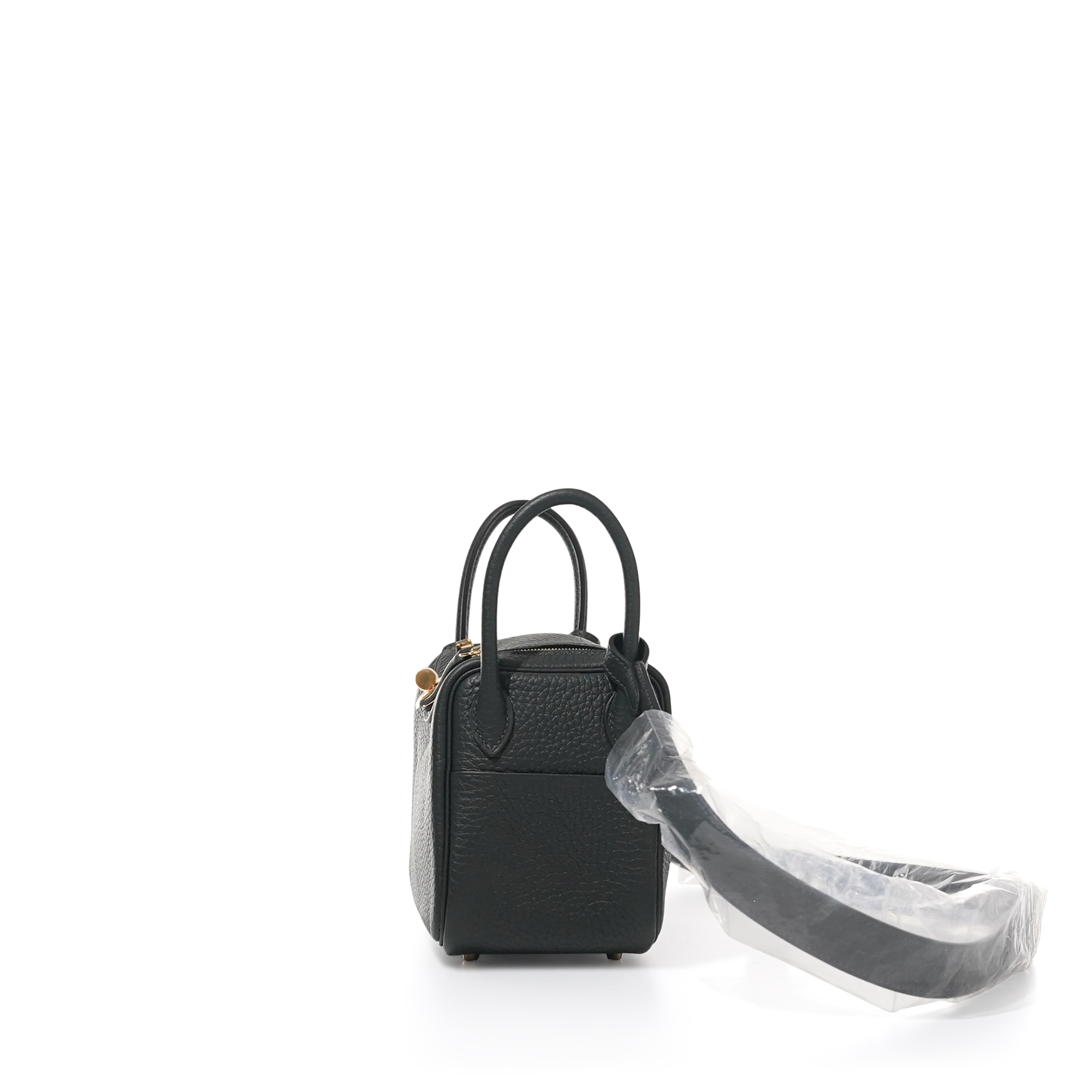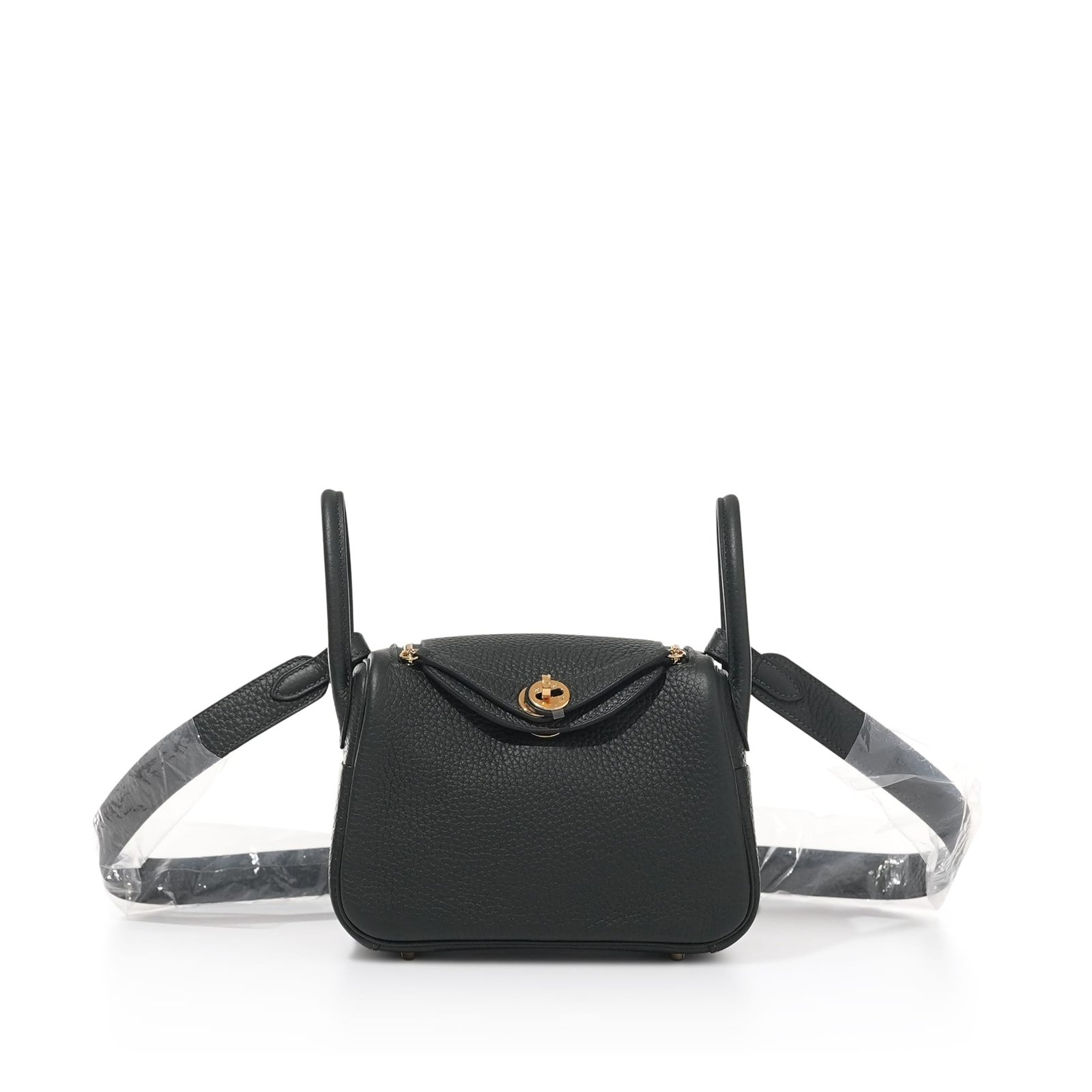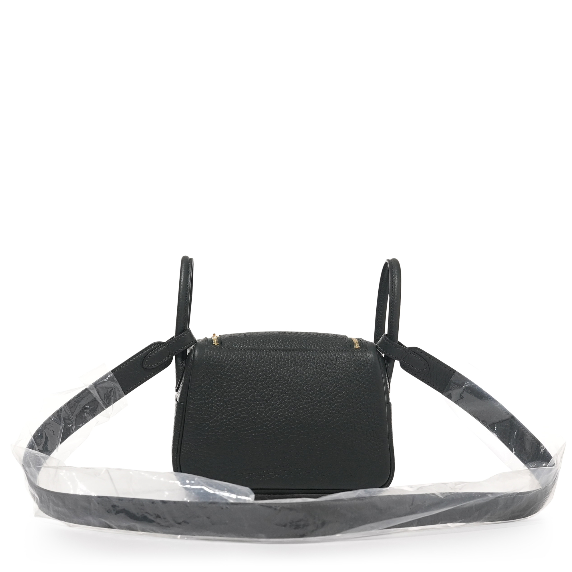 This Mini Lindy is in Vert Fonce clemence leather with gold hardware and has tonal stitching, double zipper pulls, front Hermès twist lock, single pocket on each side, two rolled top handles linked by a flat shoulder strap.