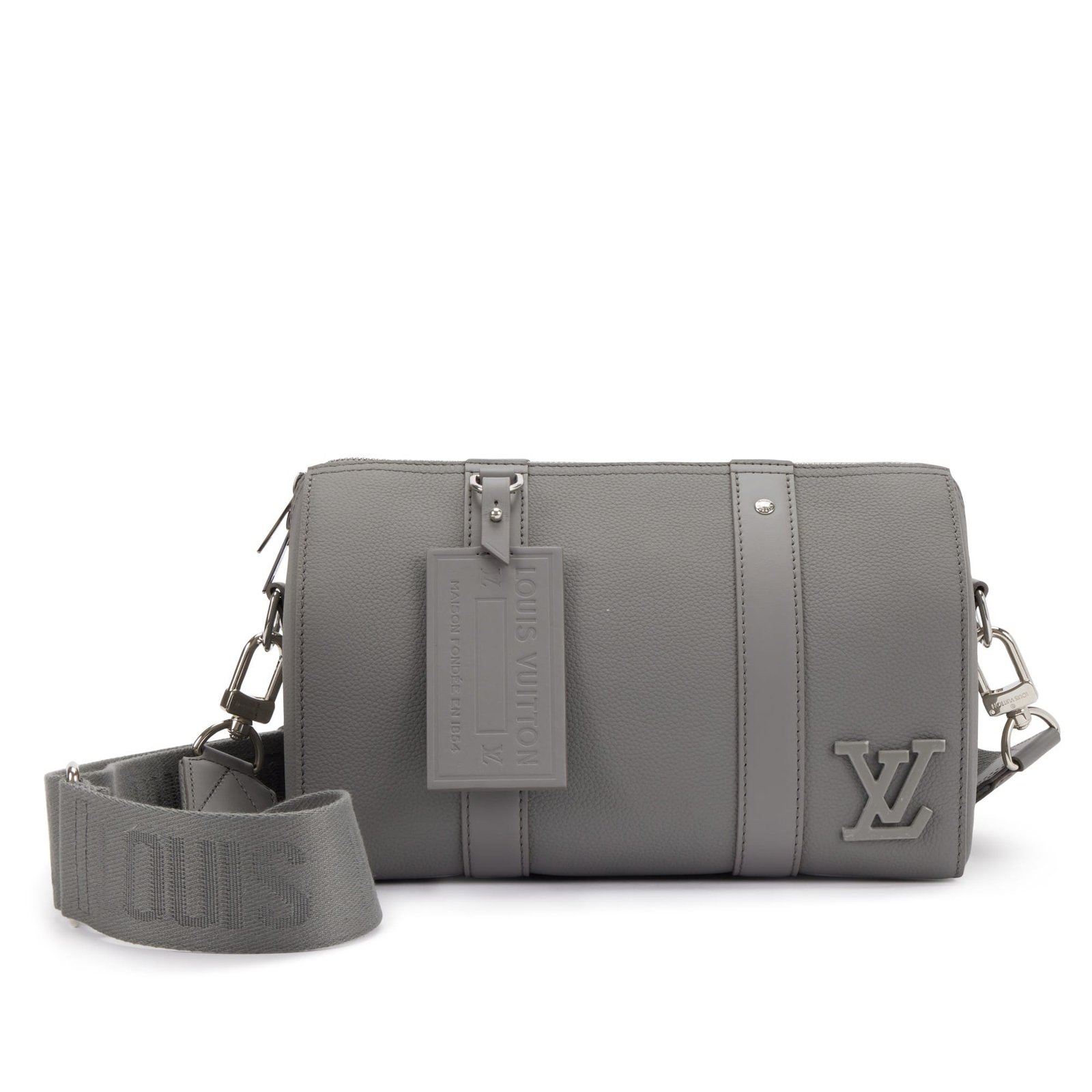 Louis Vuitton Virgil Abloh Gray Aerogram Leather City Keepall Silver Hardware, 2021-2022This bag is lined with gray textile materialIncludes leather bag charm, shoulder strap, ribbon, care card, dustbag and boxThis item is final sale and not eligible for return